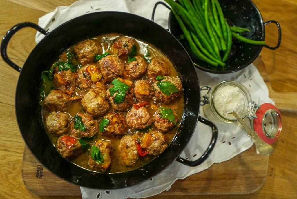 Kjøttboller: i pakke svinekjøttdeig (evt karbonadedeig)1 egg60 g hakket bacon2 ss hakket basilikum2 ss hakket rosmarin1 drammeglass fløte1/2 ts revet muskattnøtt2 finhakkede sjalottløk2 fedd hvitløk, …