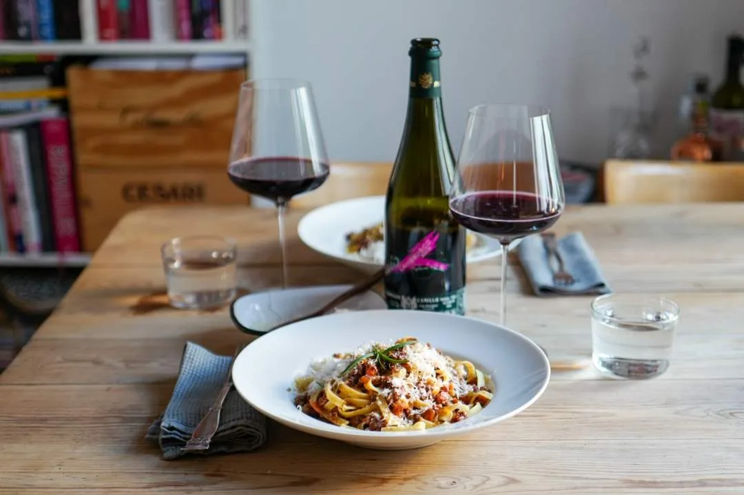 Server retten med Lambrusco. Lambrusco kommer fra området rundt Bologna og den lett perlende vinene passer perfekt til en kraftig og deilig pastarett.