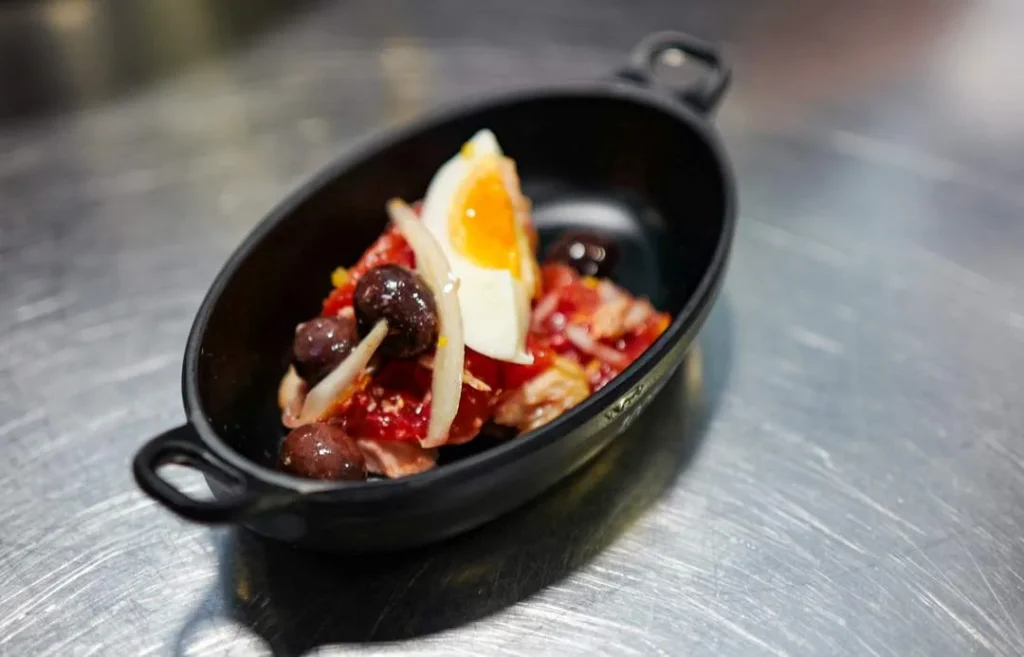 Bland løk, tomat, oliven og tunfisk. Krydre og hell over olivenolje. Legg egg på toppen.
