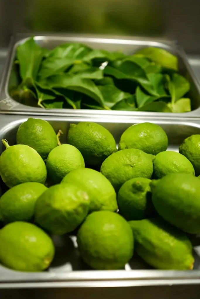 Du spiser ikke sitronbladet, men det gir smak til selve retten. Du kan være heldig å få tak i sitrusblader i butikken i vinter, enten appelsin, klementin eller sitron, så græbb til deg hvis du kommer over og vask dem veldig godt før bruk.
