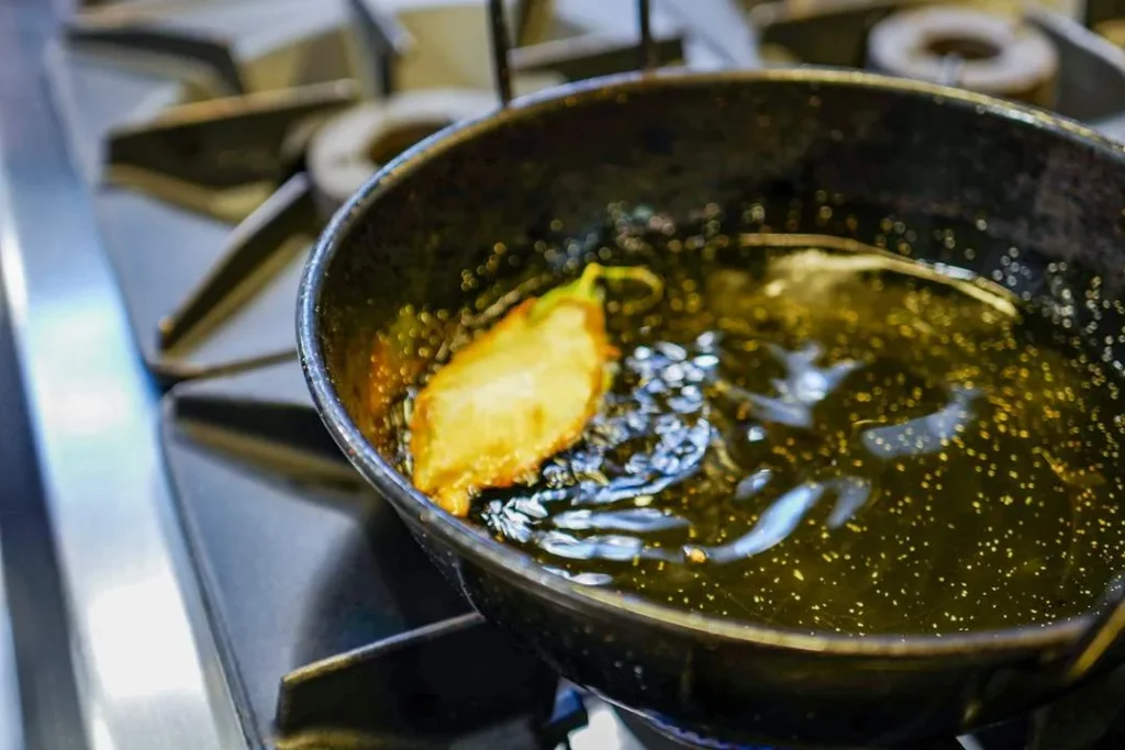 Olje til fritering. Bruk gjerne solsikkeolje som er nøytral i smak