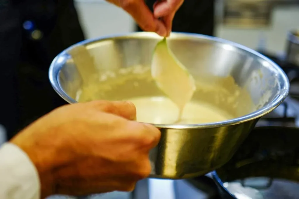 Miks egg, sukker, salt, melk, sitronskall og gjær. Spe med mel til du har en klumpefri og mellomtykk røre. La hvile i 20 min.