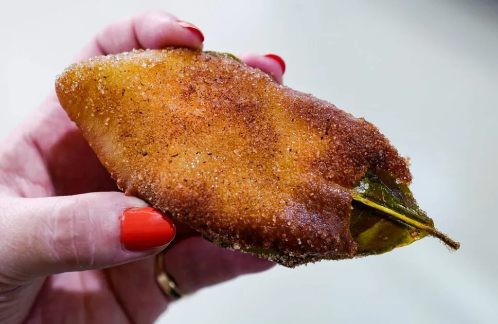 Dypp bladene i røren slik at du har et jevnt lag røre rundt bladet og legg det i varm olje som du har varmet opp. Stek i oljen til deigen er gyllen. Ha bladet over på litt kjøkkenpapir og etterpå (mens de er varme strør du sukker og kanelblanding over på begge sider. Spis mens de er varme. Ikke spis bladet.