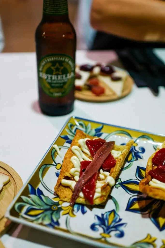 Fantasmas er rett og slett ribbesvor med majones, bakt paprika og ansjos på toppen. Jeg digger denne tapasen og den smakte så godt med det lokale ølet Estrella de Levante.