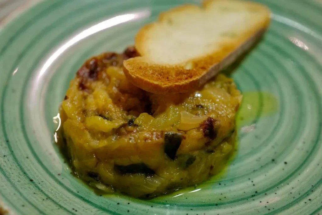 Nok en tapas fra Murcia med stekt squash og løk, hakket egg, olivenolje, salt, kokt potet som du blander godt.