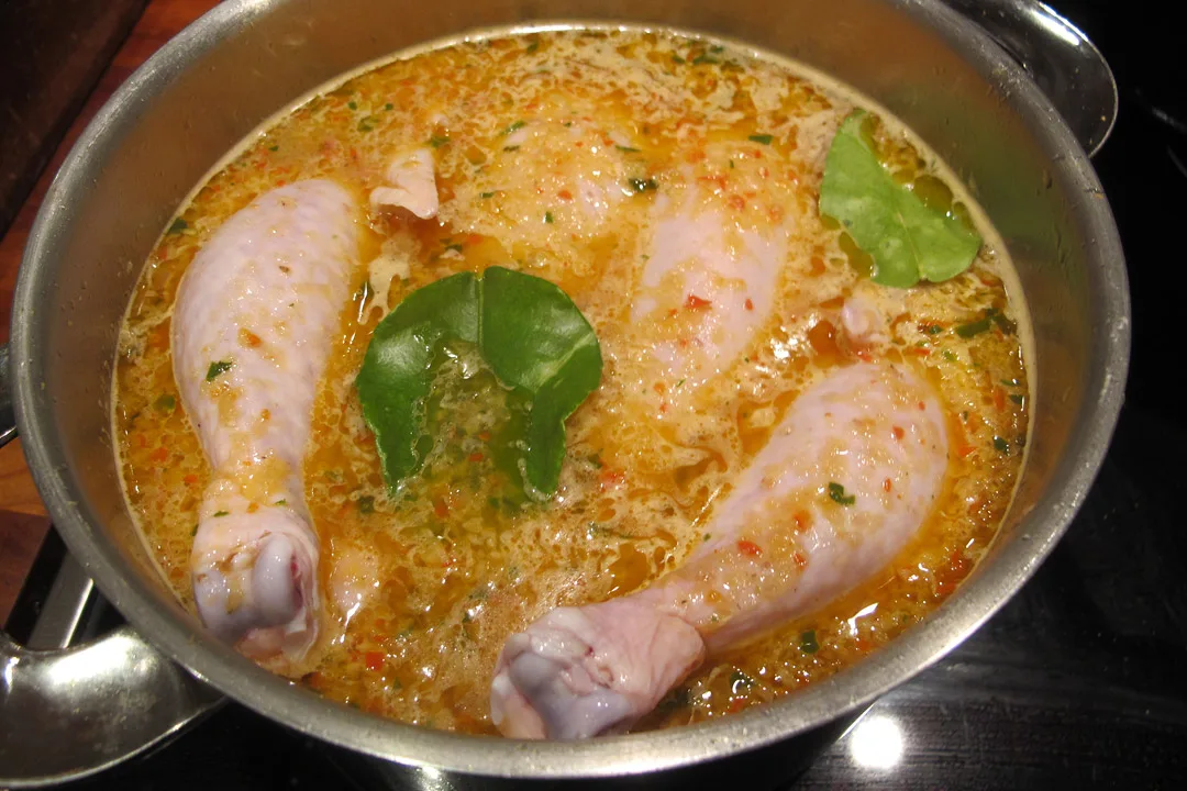 Varm en god slant nøytral olje i en gryte. Surr pasten i oljen på ganske høy varme. Tilsett 1/3 ts rekepaste (eller 1 ts fiskesaus). Legg kylllingen (som du har vasket og tørket) i gryten og fyll på vann slik at det dekker kyllingen. Legg et par kaffirlimeblader i. La kyllingen trekke i en time under lokk.