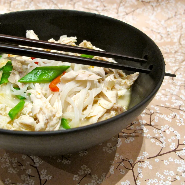Kok risnudler og legg i porsjonsskåler. Så legger du på kyllingkjøtt og heller på suppe. Pynt med frisk koriander og chilistrimler.