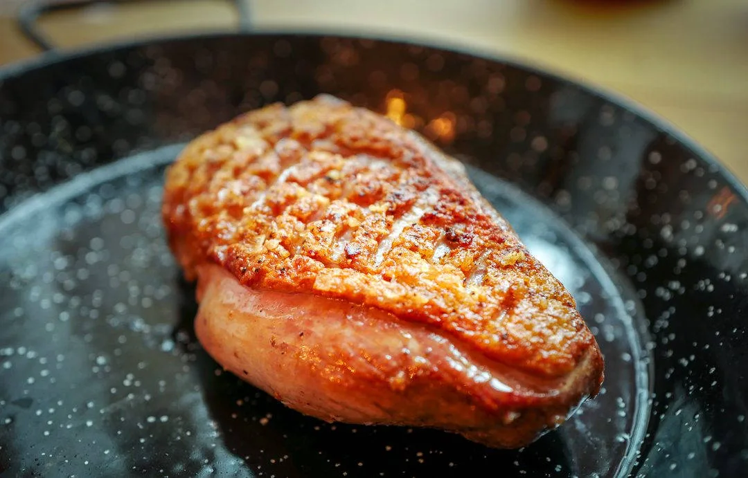 Nå kan du snu andebrystet og steke til undersiden er fin og gyllen.
