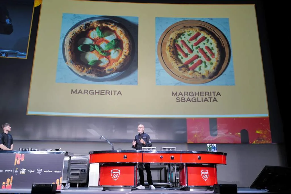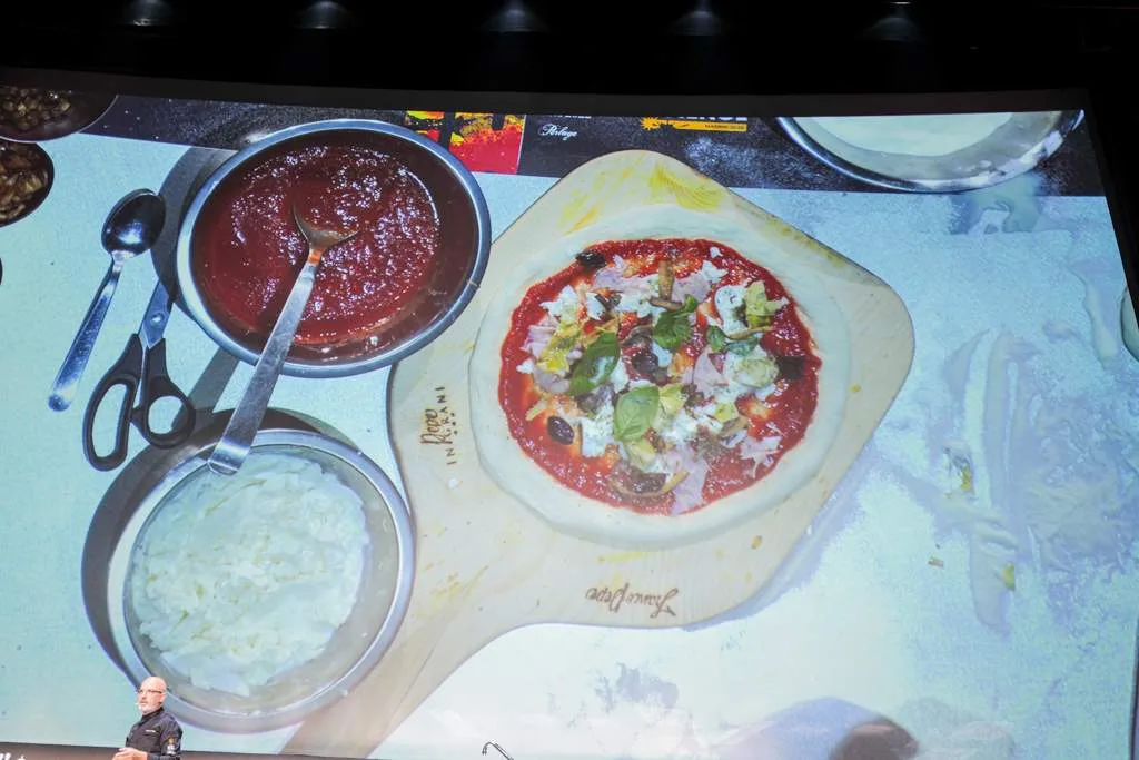 Franco Pepe fra Pepe in Grani er jo selve Mr. Pizza. Han fortalte om hvordan hans prosess har vært i forhold til å behandle en nasjonalskatt som pizza i nye formater og i moderniserte varianter. Han tok utgangspunkt i klassikeren “Capriccio” som oppleves som en veldig fuktig pizza når den serveres pga væskeinnholdet i mozzarella, sopp, artisjokker, oliven, kapers osv. Hans versjon smaker som en Capriccio, men ved å bruke andre teknikker oppnår han å presentere en versjon som er tørrere og mer konsentrert i smaken. Han bruker blant annet tørking, steking, fritering som metoder i denne pizzaen. Svært interessant demonstrasjon.