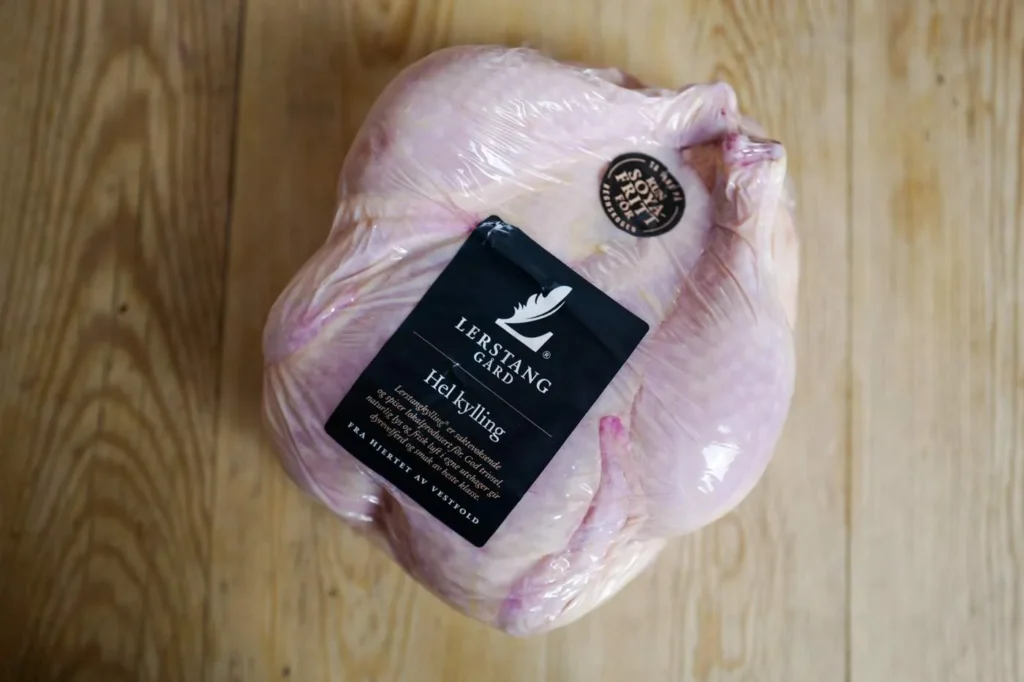 Jeg har brukt Lerstangs kylling. De er matet med soyafritt fôr. De store, lubne kyllingene er min foretrukne til denne retten. Jeg steker den på lav varme (150 grader) og resultatet er en kylling som smelter i munnen. Kraften fra kyllingen og alle aromatene den koser seg sammen i ovnen gir den beste skyen du kan tenke deg. Når fløtepotetene (som ligger i ovnen med en blanding av fløte, flaksalt, klementinskall, rosmarin og litt hvitløk) blander seg med skyen oppstår det magi på tallerkenen.