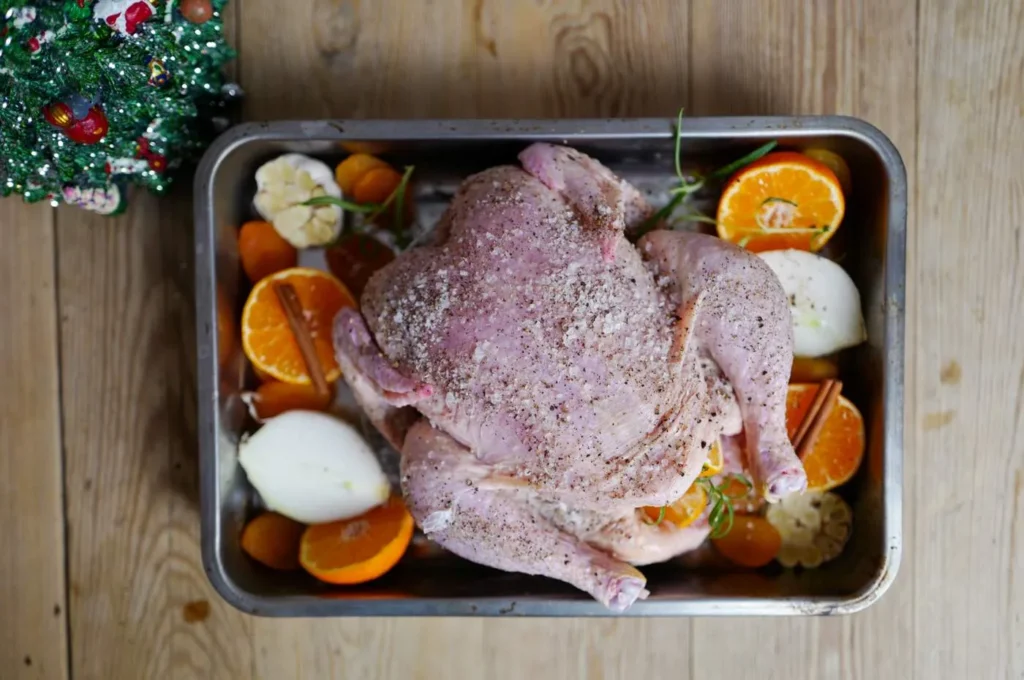 - Rundt kyllingen (men rett i formen, ikke på risten) legger du en hel hvitløk delt i to, en løk delt i to. 2-3 klementiner delt i to, kanelstenger, aprikoser og noen små kvister rosmarin.