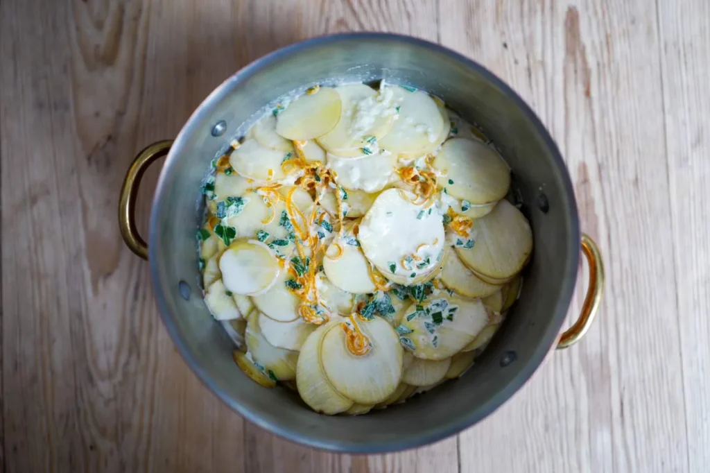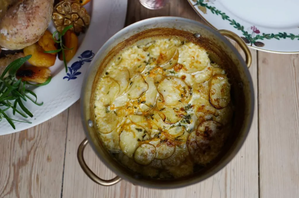 - Potetene: Skjær supertynne skiver av potetene. Bruk helst mandolin. Legg lagvis i en ildfast gryte eller form med lokk. Bland fløte, salt, hakket rosmarin, finhakket hvitløk og klementinzest. Hell over potetene og sett på lokket. Sett i ovnen sammen med kyllingen i ca 1 time eller til potetene er myke. Du kan ta av lokket de siste 10 minuttene for å få kokt inn fløten, hvis du synes det trengs.