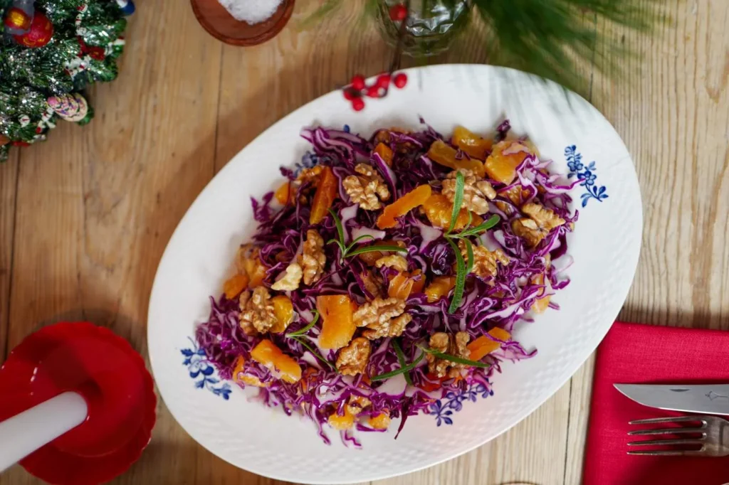Rødkålsalaten består av strimlet rødkål, varme valnøtter, klementin og tørkede aprikoser. Den blandes med en vinaigrette av årets olivenolje, litt dijonsennep og klementinsaft, som er mildere enn en vanlig vinaigrette som er laget med eddik eller sitron. Alt harmonerer perfekt.
