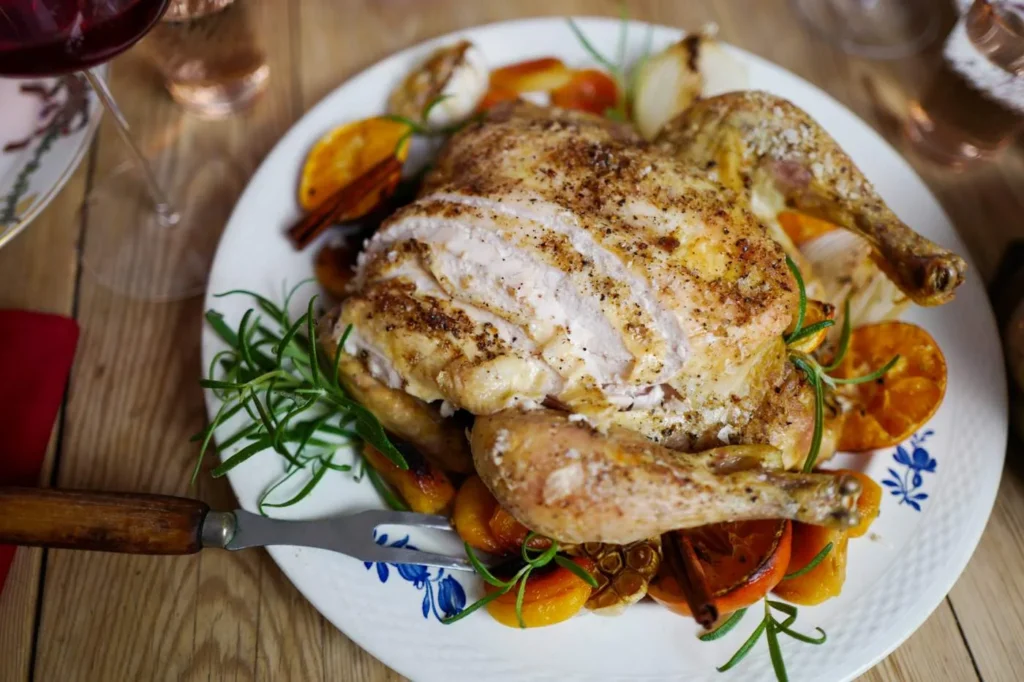 Jeg har laget det som må være den beste kyllingretten i hele verden. Nylig satte jeg og Erik denne festretten til livs og jeg må bare si det: Aldri før har jeg laget bedre kylling. Jeg ville lage en kyllingrett som passer midt på bordet på selveste julaften. En rett som oser av julestemning og fest. Det har jeg klart. Smaksbildet går mot marokkansk tajine med de varme smakene av nøtter, tørket aprikos og kanel. Men kun et hint. Så har vi rosmarin og klementin for å få inn jul. Kombinasjonen var jeg spent på, men de fungerte så perfekt. Det er egentlig umulig å beskrive hva retten smaker som, men alt harmonerte. Fra fløtepotetene til rødkålsalaten til selve kyllingen.