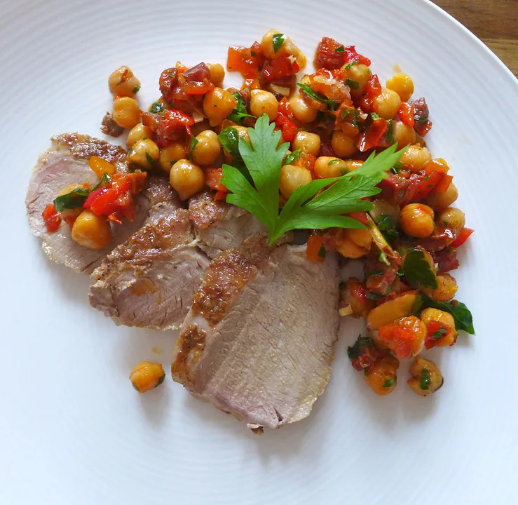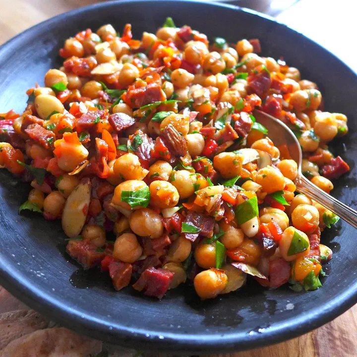 Varm en panne med litt nøytral olivenolje. Tilsett kikertene og chorizoterningene. Svitsj i pannen noen minutter før du krydrer med salt og pepper. Tilsett paprika og tomater samt mandler. La småsurre noen minutter. Tilslutt tilsetter du bladpersille og noen gode spiseskjeer fulle med deilig extra virgin olivenolje.