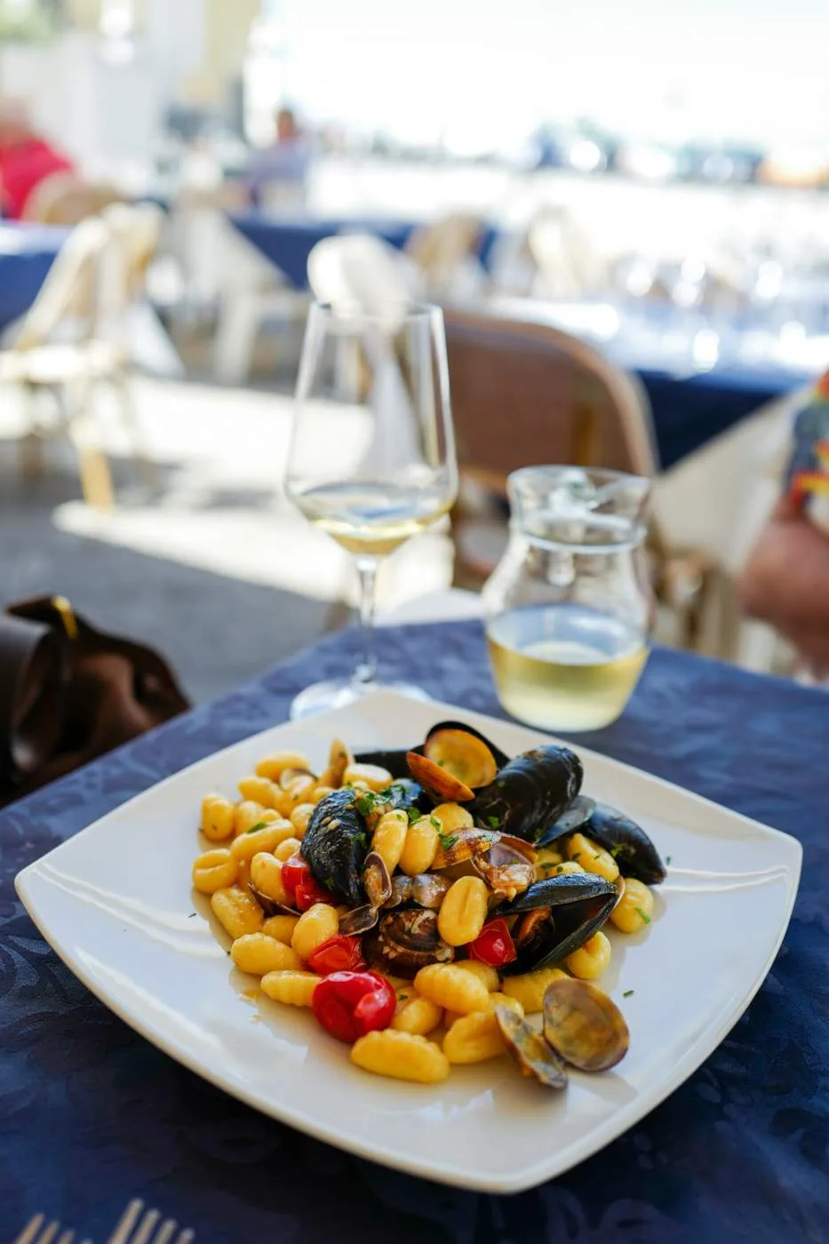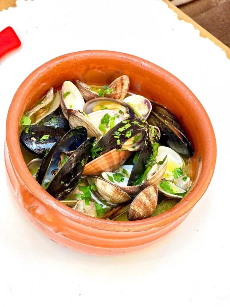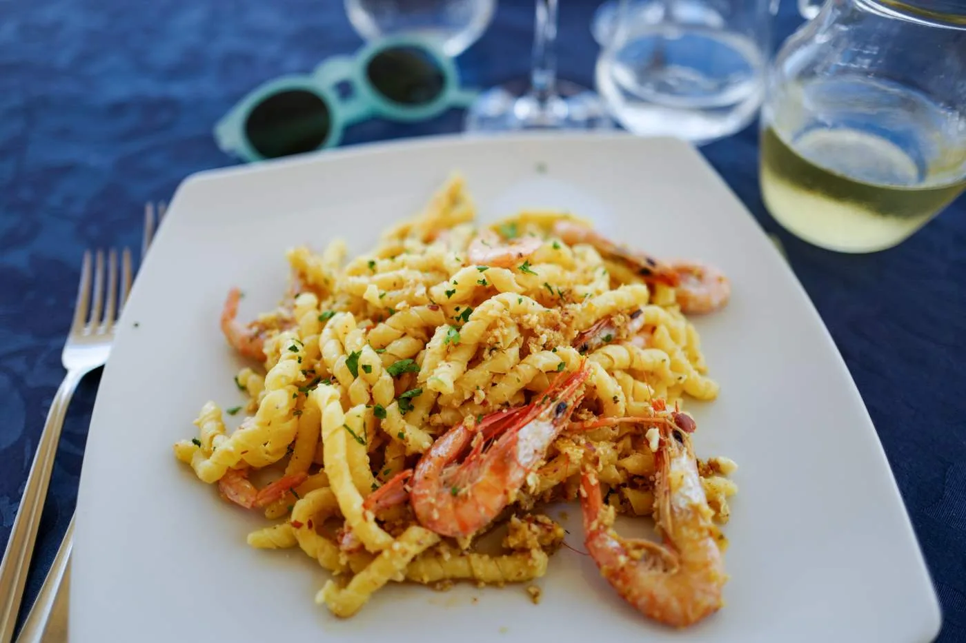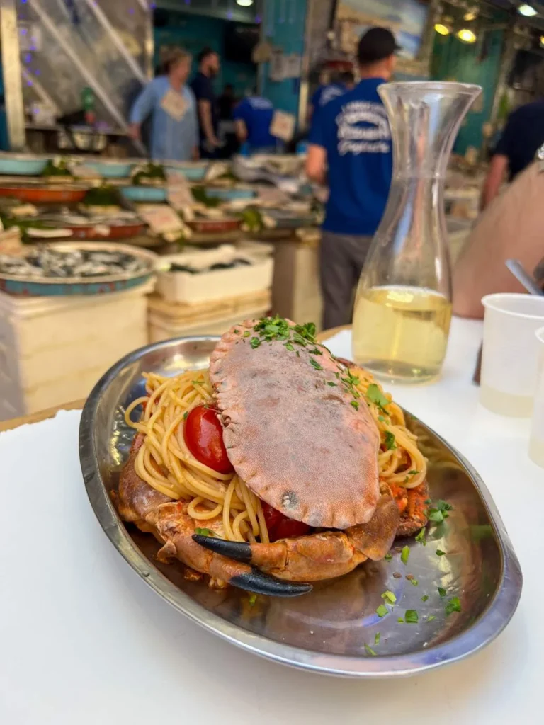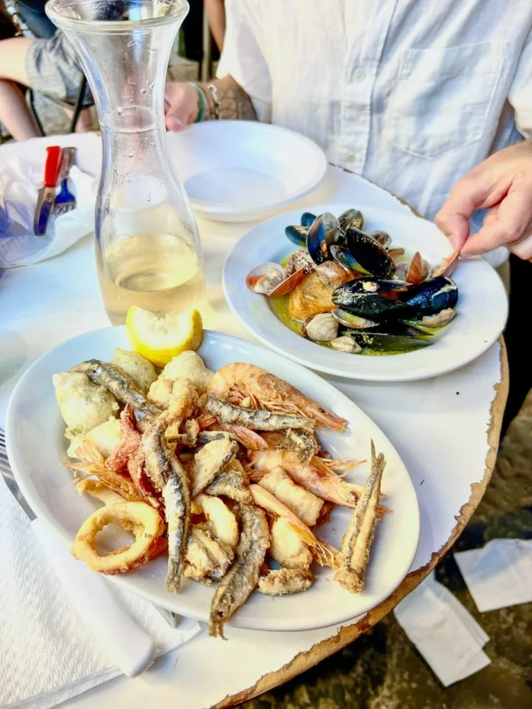 Sørg for å få et bord på Pescheria Azzurra. Dette er en fiskebutikk som ved lunsjtider setter ut noen bord der de servere sprellfersk sjømat rett fra egen butikk og mors kjøkken. Prøv den lokale spesialiteten Miste fritto di mare, frityrstekt sjømat av ypperste klasse. Prøv også skjellene som er dampet og servert med den nydeligste olivenoljen. Pastarettene er også en opplevelse. Jeg anbefaler virkelig spagetti med krabbe og tomat selv om det er litt jobb. Neste gang dropper jeg hvit skjorte også. Krabbe vs Helle 0 – 1. Krabbe vs hvit skjorte 1 – 0