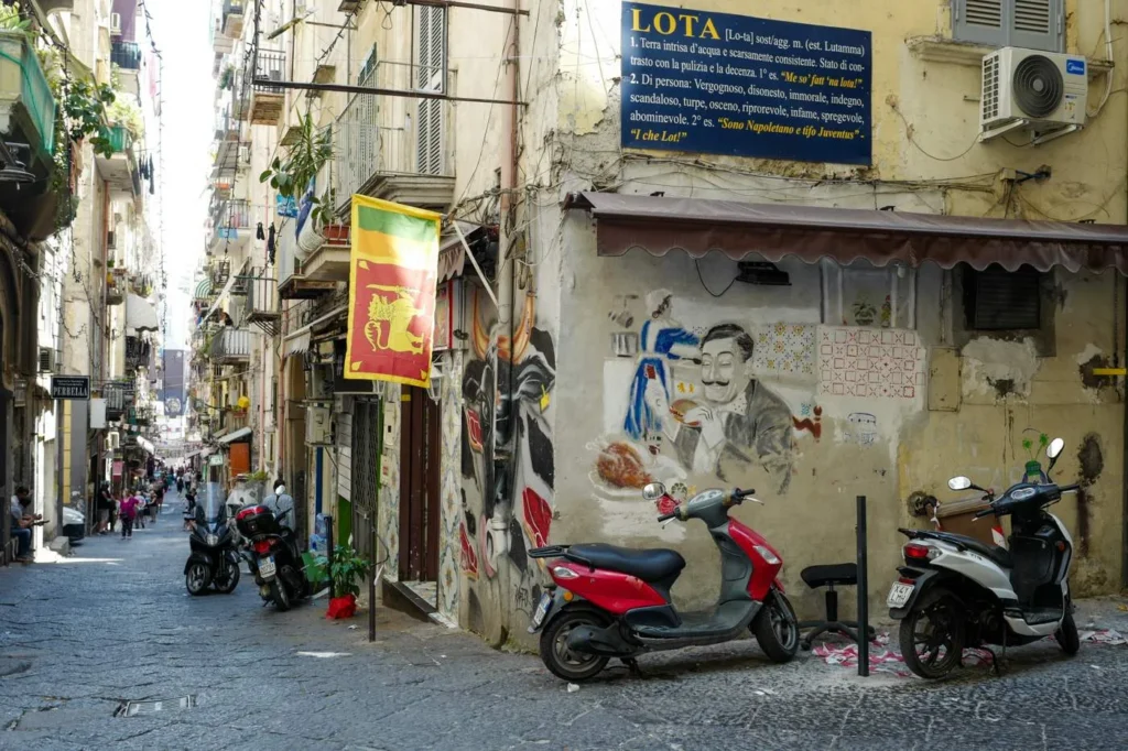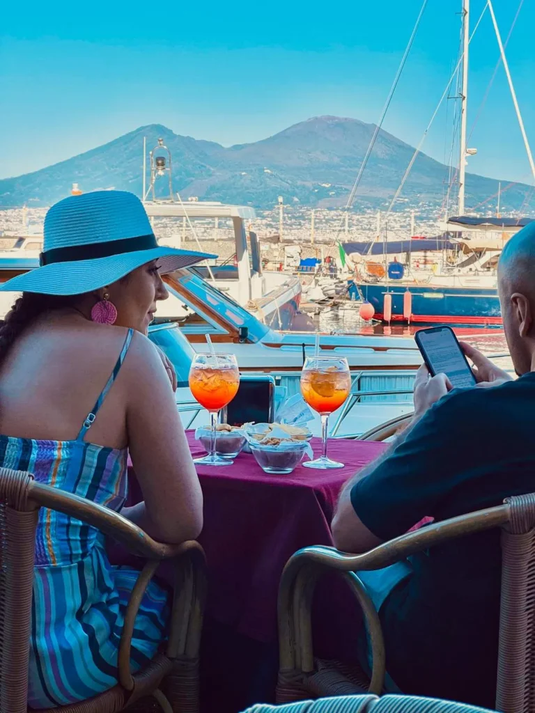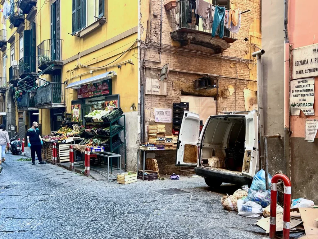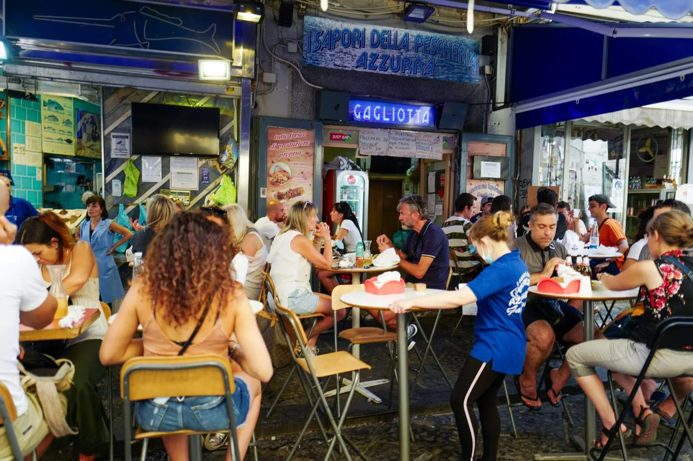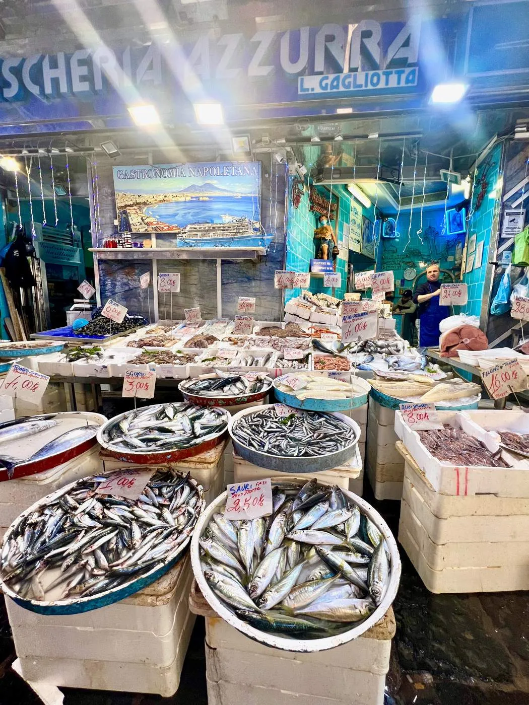 Det er superkoselig å sitte der og vi har spist på La Scialuppa Restaurant, vi. Helt ok mat, men det er ikke på disse stedene du får den beste sjømaten. Da må du opp i hjertet av Napoli og de småsnuskete gatene ved Via Pignasecca, et lite og autentisk nabolagsmarked.