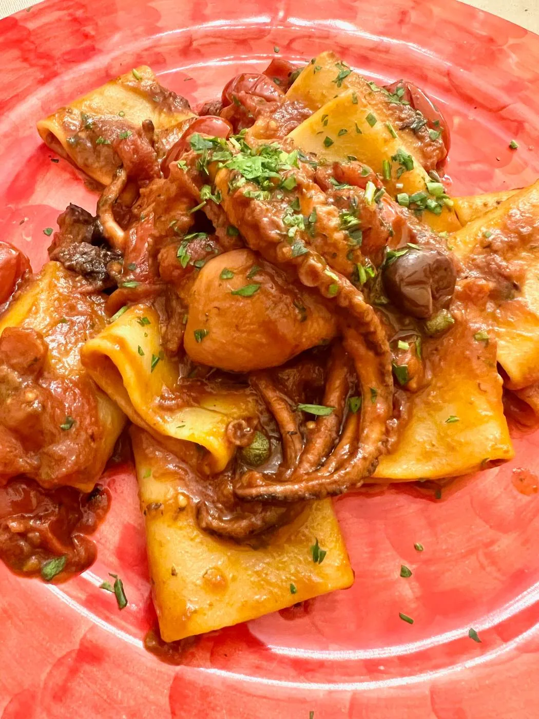 Vi falt pladask for Ristorante da Maria alla Corricella og eier Maria Lotorchisco. Den eldre damen er en en av øyas yrkesfiskere. Hun har blitt litt av en kjendis. I restauranten får du virkelig god mat og hvis du spør om det finnes noe annet som ikke står på menyen, da får du virkelig godsakene. Vi fikk deilig tunfisktartar til forrett og den beste kråkeåbollepastaen jeg har smakt. Også ravioli med fisk, sitron og gule tomater var en ren nytelse.