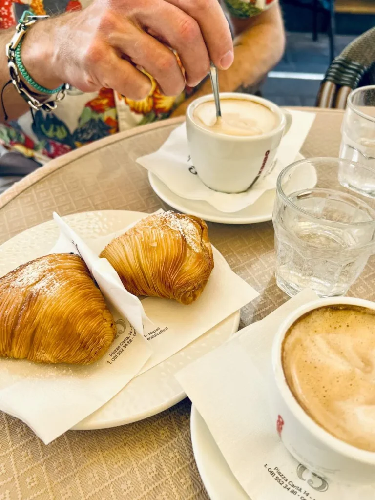 Reis ikke fra Napoli uten å ha smakt disse kakene. Perfekt til en sterk kopp kaffe, men også nybakt og varm direkte fra bakeren. Bakverket er konstruert som et slags skjell med tynne, tynne lag sprø deig. De er fylt med appelsin,ricotta, sitronskall og mandelmasse. Dette er sfogliatella ricci. Sfogliatella frolla ser mer ut som en bolle, men smaker like godt og er enklere å spise. Hos Pintauro i hovedgata Via Toledo kan du kjøpe dem rett ut fra ovnen.