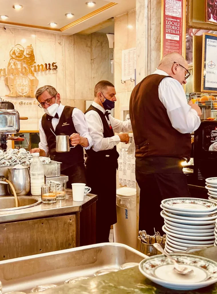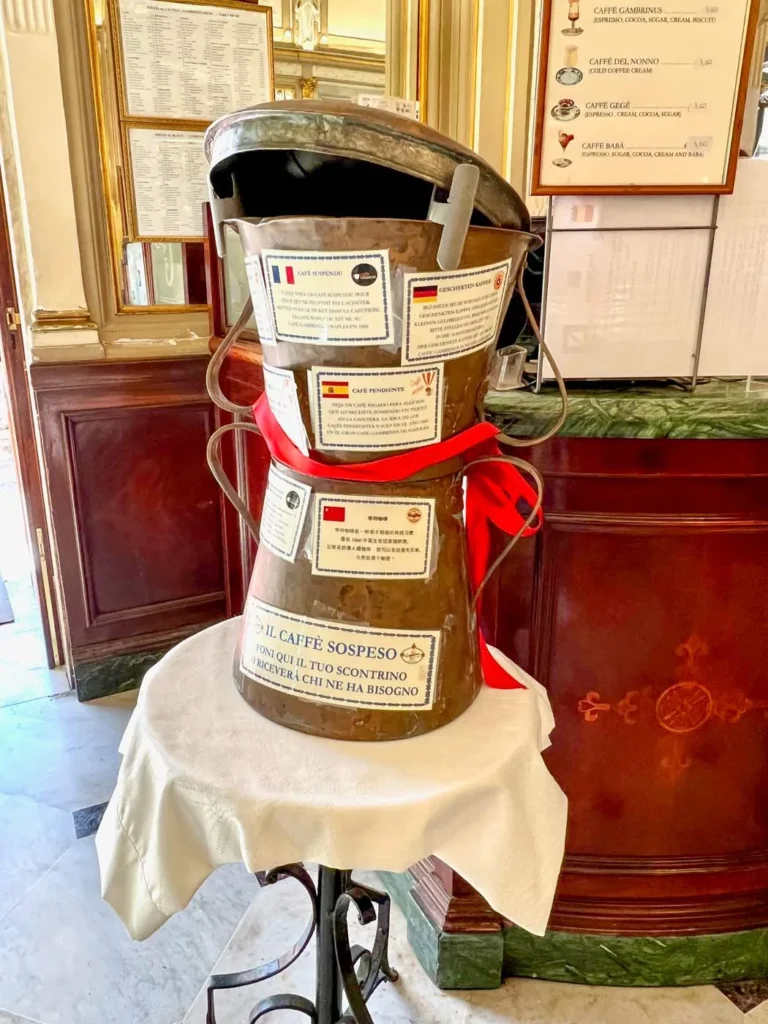 Flere av disse stedene har også et system som heter caffè sospeso. På Gran Caffè Gambrinus kan du kjøpe en ekstra kaffe og legge kvitteringen i en stor kaffekanne ved kassen. Denne kvitteringen kan løses ut av en som ikke har råd til kaffe. Napolitanerne mener at kaffe er en folkerett og derfor finnes dette flotte systemet. Husk å be om en caffè sospeso neste gang du bestiller kaffe så får noen andre gleden av en kopp også.