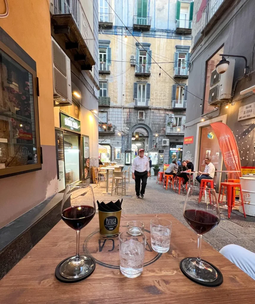 Puteca Wine Bar ligger helt fantastisk til i trappa ved Gradoni di Chiaia rett ved den flotte arken Ponte di Chiaia. Utvalget er stort av både italiensk, fransk og spansk naturvin, men dessverre er de ikke flinke nok til å servere vin med riktig temperatur. Det er uansett utrolig hyggelig å sitte ved et av bordene i trappa.
