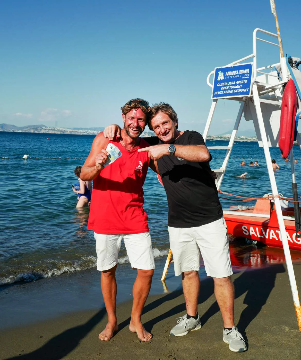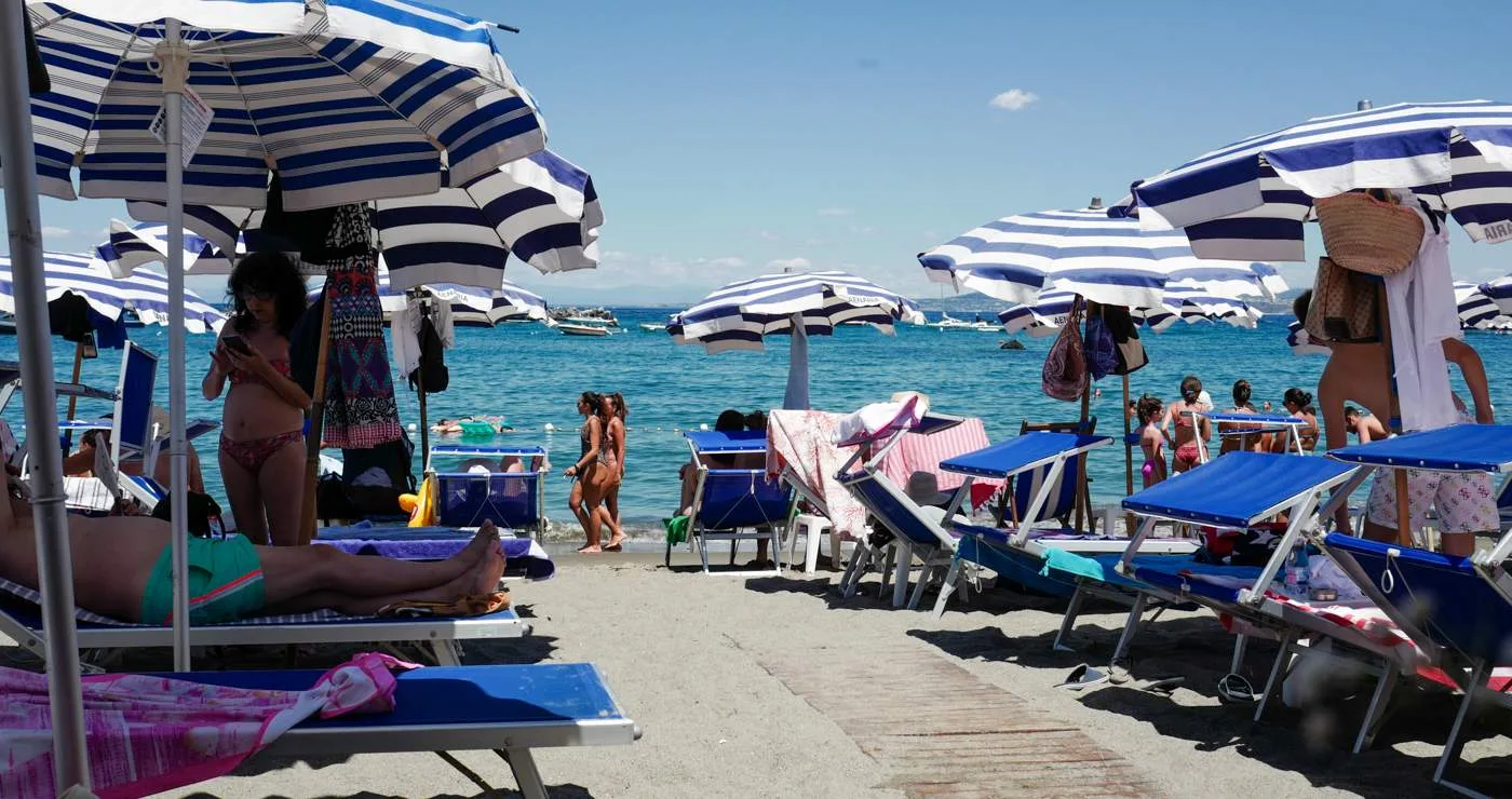 Rett nedenfor på stranden fant vi fort det stedet vi ville leie solsenger. Aenaria Beach har også koselig og god restaurant. Carmine (eieren) og Mimmo tok så godt vare på oss, sørget for at solsengene var i tipp-topp stand og i riktig retning i forhold til solen og de forsynte oss med ferskenvin og snacks utover dagen. Stranden er nydelig. Anbefaler virkelig å besøke de to gutta og deres strand. Man må betale for solsenger og parasoll på de aller fleste strendene i Italia, men det er ikke så dyrt og det er så absolutt verdt det.