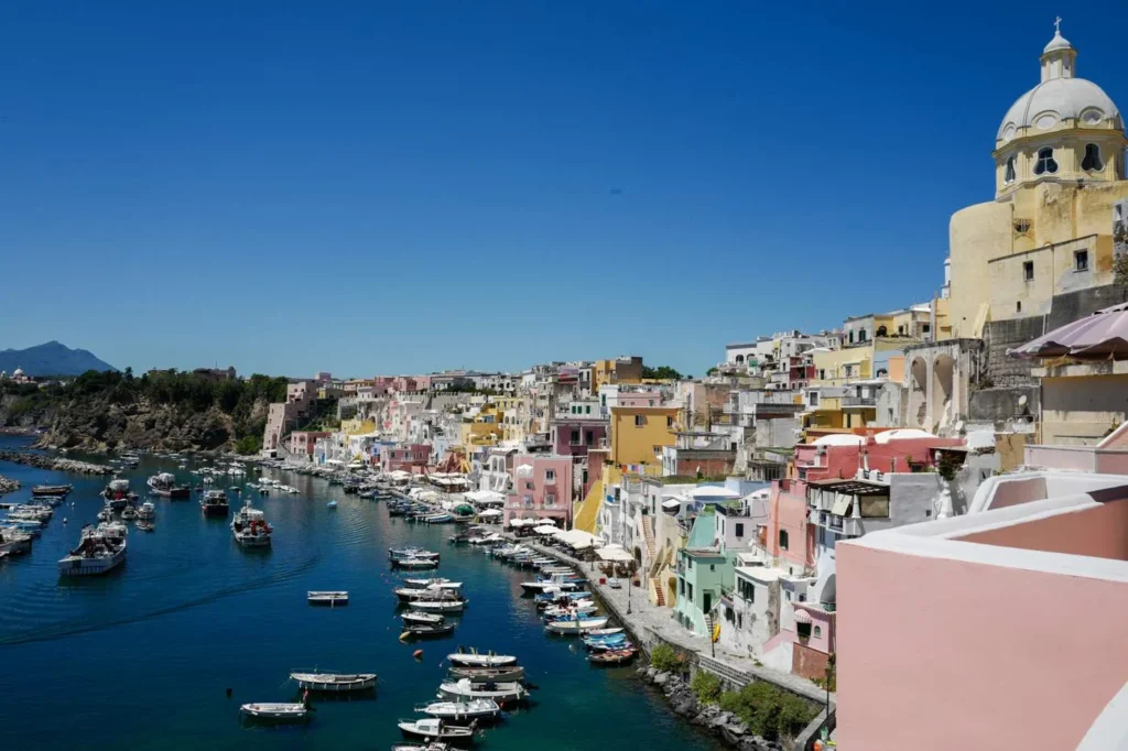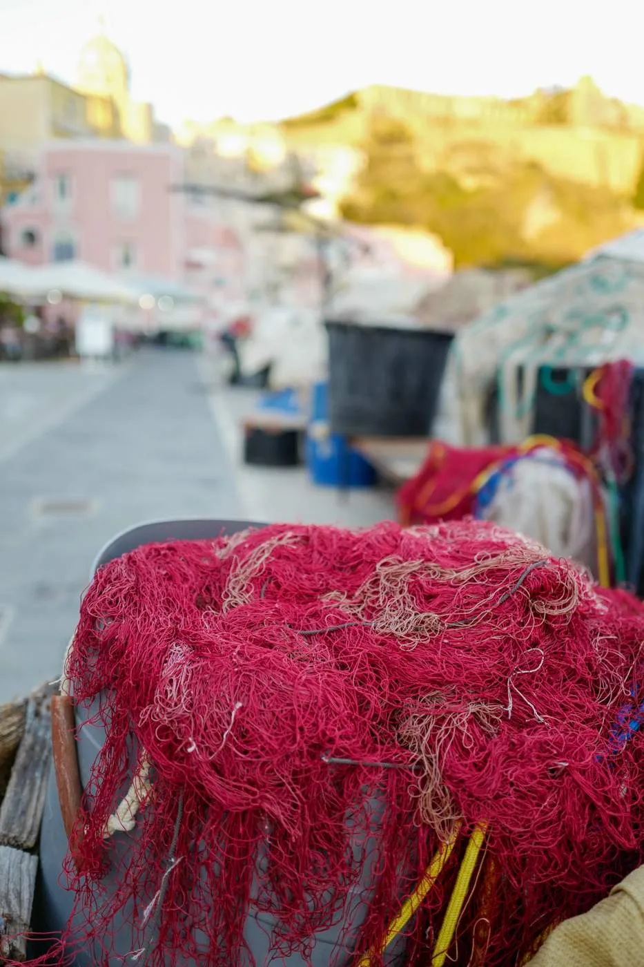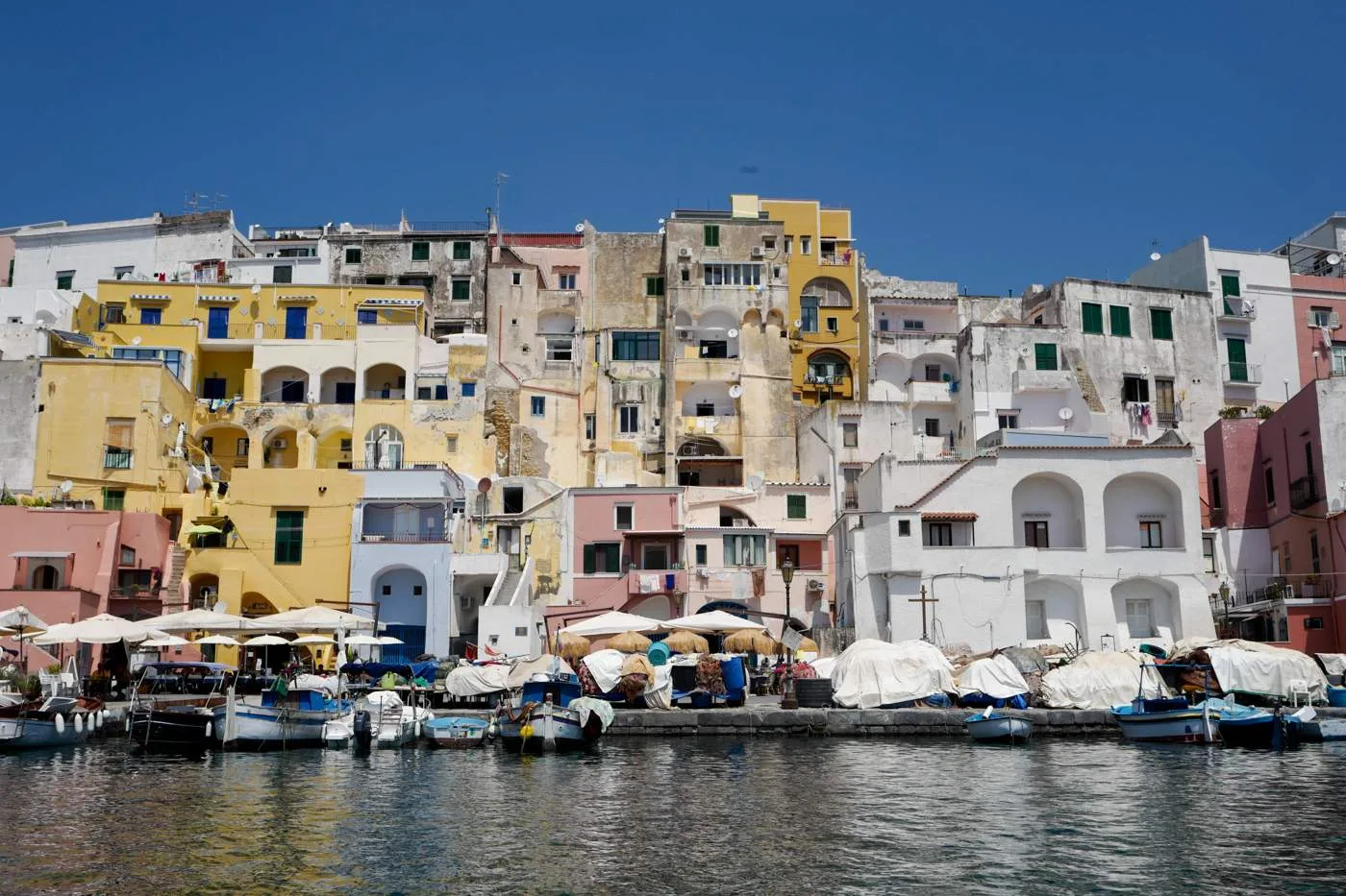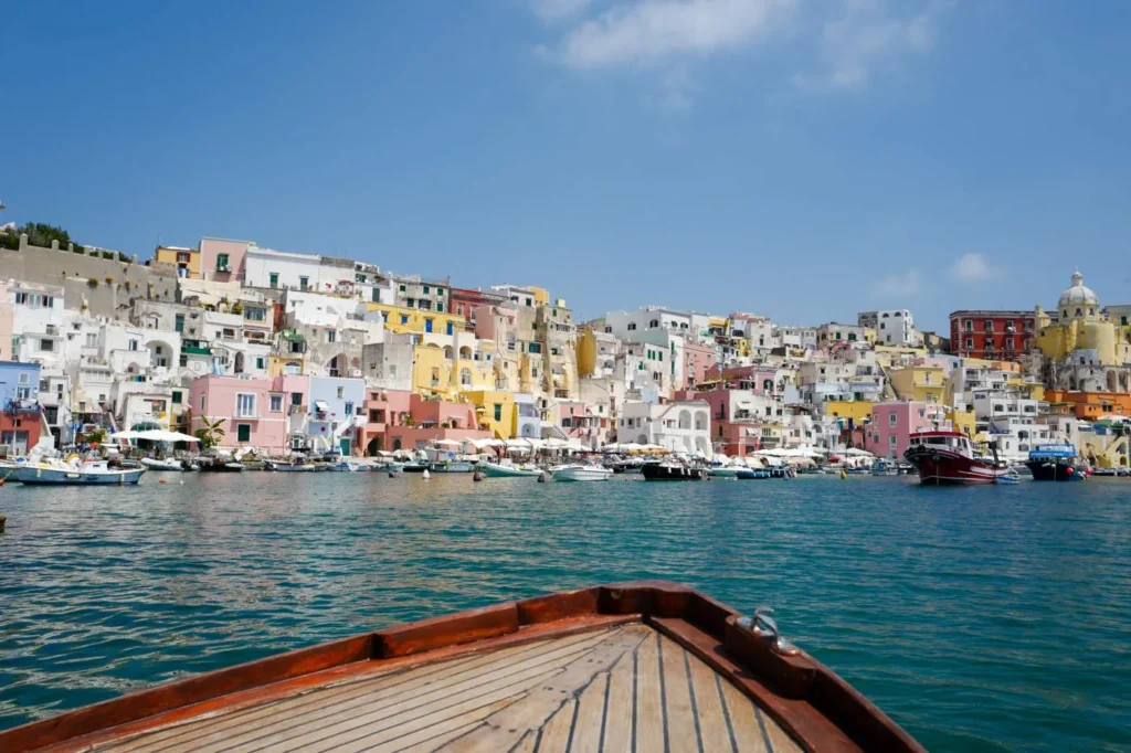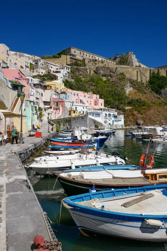 Det holder å være en dag eller to på Procida. Bruk heller lengre tid på Ischia. Det er koselig i havna der de store båtene kommer inn også, men det er virkelig på Corricella-siden det er idyllisk. Fremdeles en aktiv fiskehavn for småbåter og husene er slitte, og i mine øyne helt nydelige.