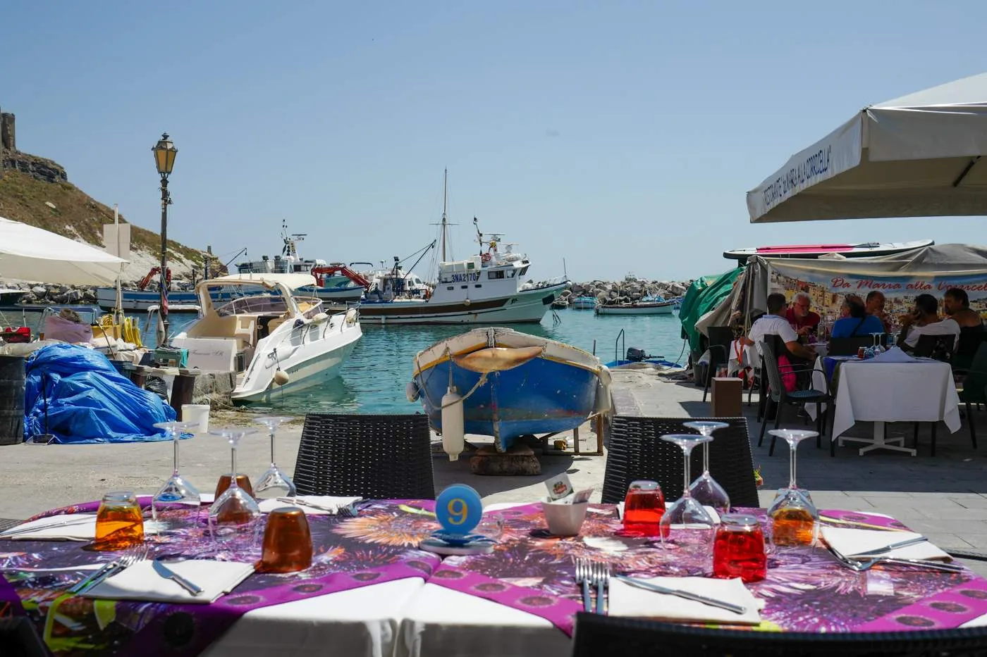 På havna prøvde vi også Ristorante Gorgonia som vi ikke syntes var så bra. Flott beliggenhet, men ikke det helt store. Men tilreisende synes åpenbart det er bra for det kom små båter med festkledde folk fra andre øyer akkurat for å spise her.