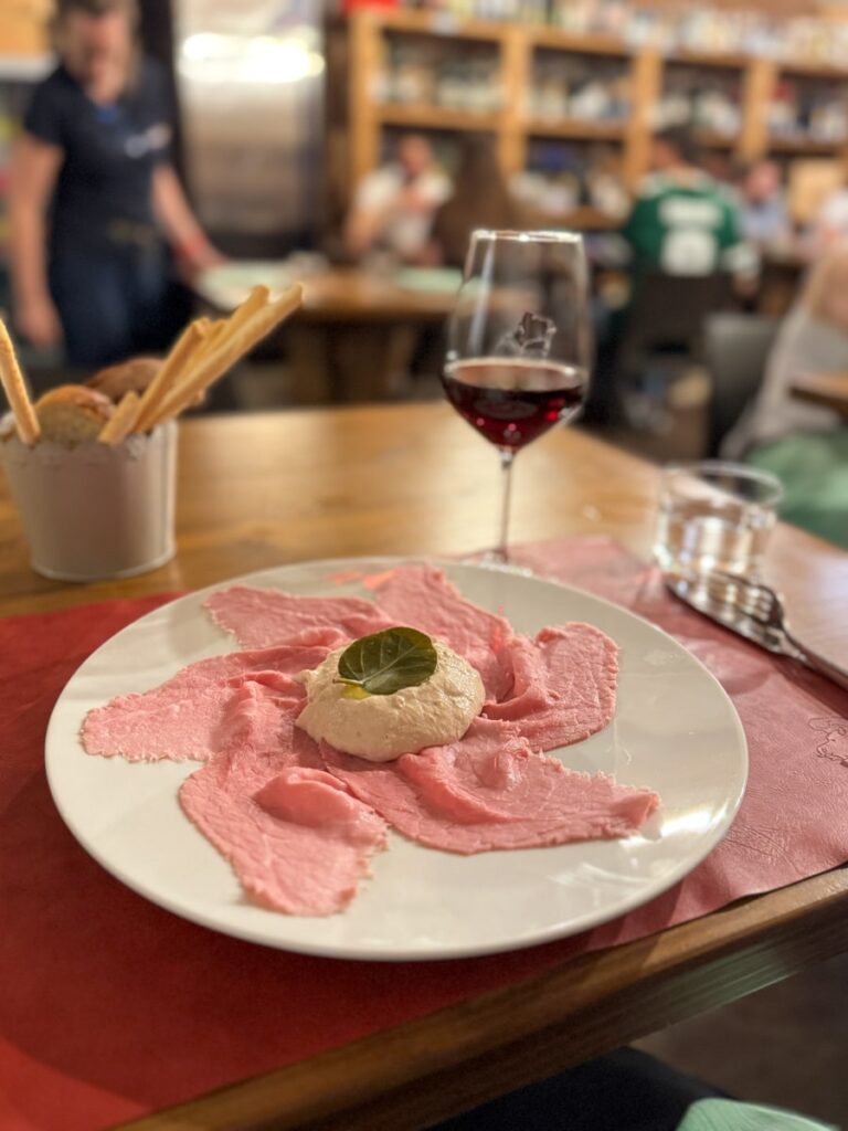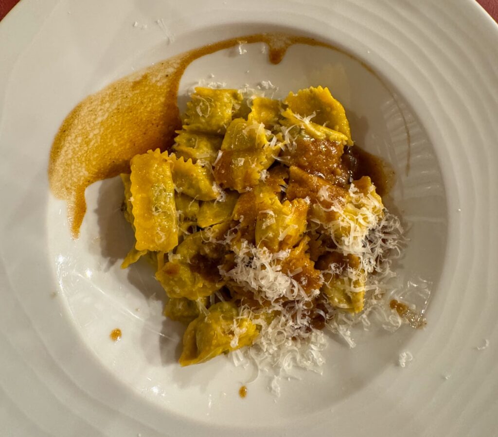 Hver region i Italia har sine pastaspesialiteter. I Torino spiser man Tarajin som er tynn pasta laget med enorme mengder eggeplomme. Men du må også prøve agnolotti, ravioli-aktig pasta fylt med enten kjøtt eller grønnsaker. Jeg fikk en deilig variant av agnolotti del plin, som angir måten pastaputene er lukket. På Le Vitel Etonné serverer de nemlig en deilig variant av denne retten fylt med tre typer langtidsstekt kjøtt og med saus på toppen. Kraftig kost i 35 grader, skal jeg si deg. Men jeg satt i den koselige vinkjelleren og der var det svalt.
