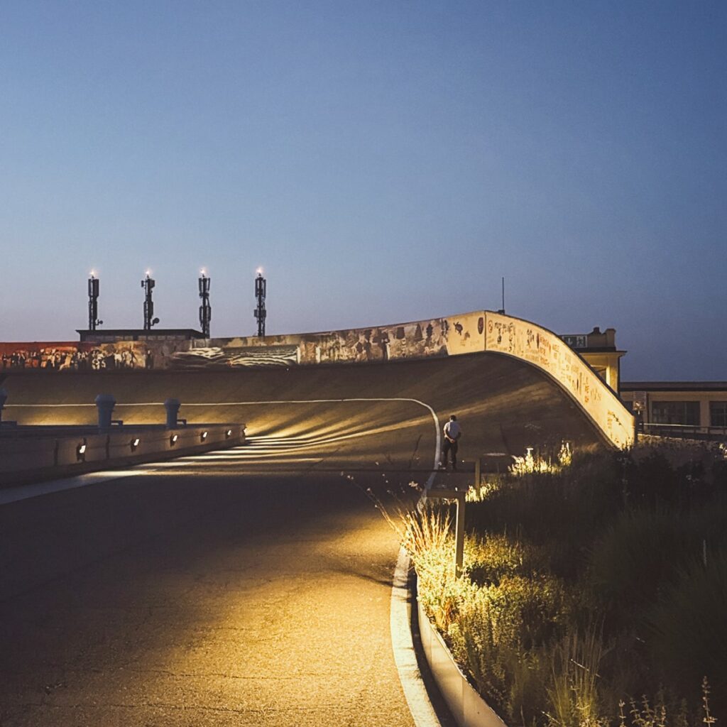 På taket av Lingotto-bygningen ligger utendørs-kunstprosjektet La Pista 500 der Fiat-fabrikken testet sine biler. På taket er det bilbane og i midten av bygget er det en spiralformet løype for bilene å kjøre opp og ned.