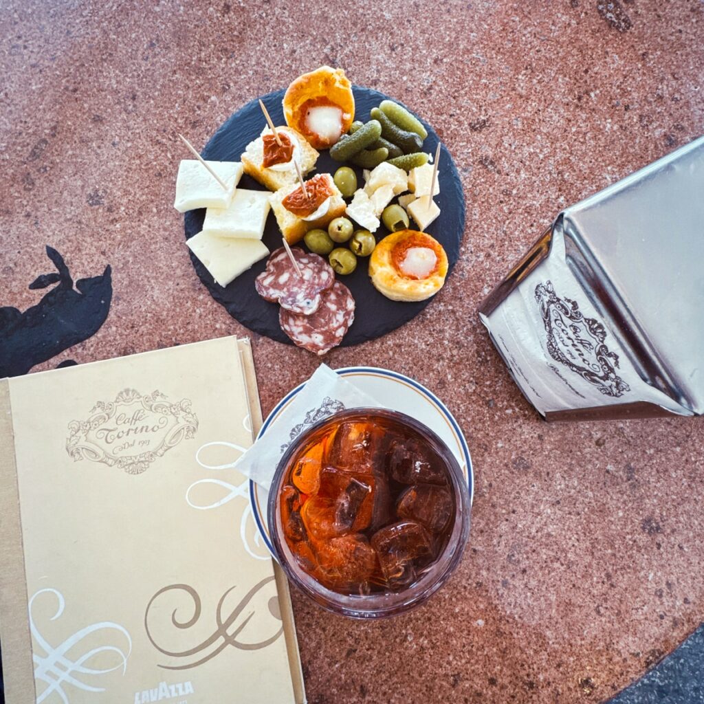 Caffè Torino er også en av de klassiske kaféene som også fungerer som aperitivosteder. Her får du selvsagt også litt mat til drinken og utvalget varierte fra spekemat, ost til minipizza. Lekkert og deilig. Kafeen ligger på San Carlo-plassen under de svale buegangene. Martini er vermuten som brukes her, og det skjønner du fort når du ser stedet, for i buegangen henger et gigantisk, vintage Martini-skilt i neon. Deres Milano-Torino er en god introduksjon til vermut da den er ganske snill og mild.