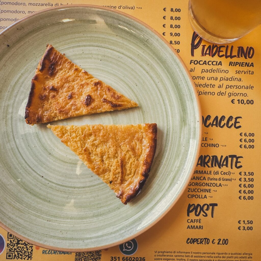 Jeg prøvde begge deler på Padellino & Farinata, et sted der kun lokalte satt i lokalet da jeg var der. Da jeg kom var alle plassene tomme, men minutter etter var stedet stappfullt. Jeg likte pizzaen godt, og især deres farinata, men jeg foretrekker den napolitanske varianten av pizza. Dette er noe helt annet. Men jeg anbefaler deg definitvt å prøve.