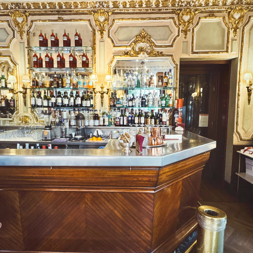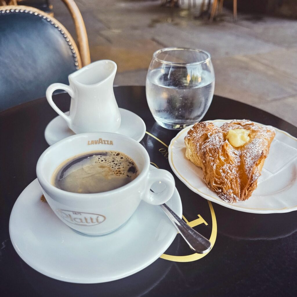 Rett ved mitt hotell ligger også en av disse staselige gamle kafeene som både er kafé og bar. Caffè Platti var stedet jeg spiste frokost. Det har eksistert siden 1875, så de kan greiene sine. Jeg bestilte fylt cornetto og kaffe hver morgen. Jeg vekslet mellom pistasjkrem og vaniljekrem. Begge var selvsagt fantastiske. Å sitte slik på kafé og se på folk om morgenen er det koseligste jeg vet.