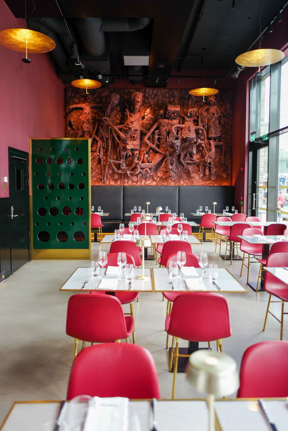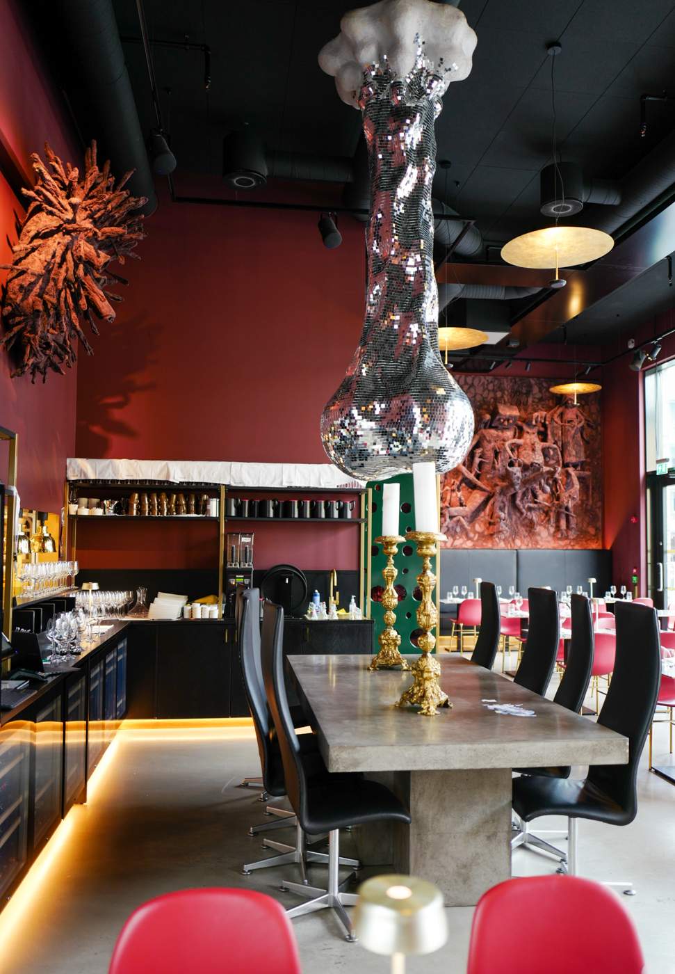 Lokalet er malt i en nydelig farge som er en blanding av fuxia og rød jordfarge. På hver kortvegg henger verker av Killi Olsen. Å se slike storformat-verker av en så internasjonalt anerkjent kunstner føles som en ære. Figurene på veggen er både skremmende og vakre. De minner om afrikanske baobab-trær som vikler seg inn i hverandre.