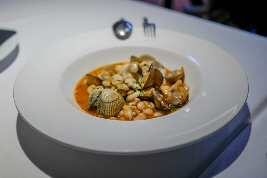 Vi har lyst på alt på menyen. Det er rett og slett så vanskelig å velge og vi bruker lang tid på å bestemme oss. Vi lander på ansjoser til forrett da Erik ELSKER ansjoser. Så går vi for berberechos (skjell) med hvite bønner i en fantastiske lekker skalldyrkraft.