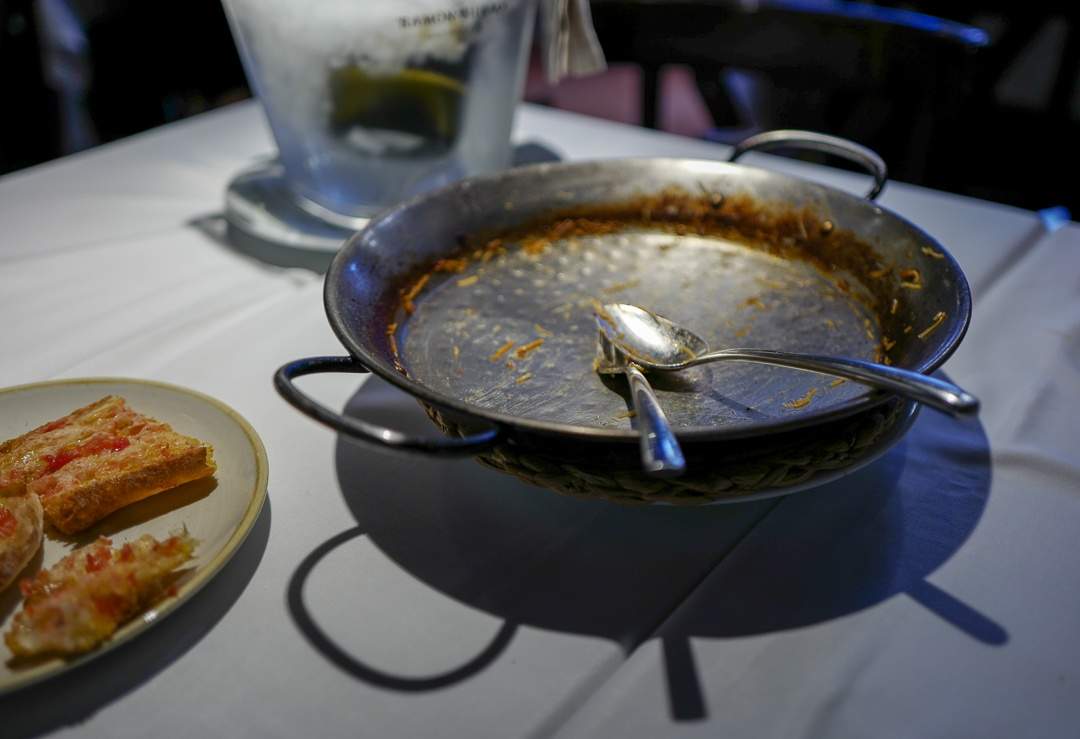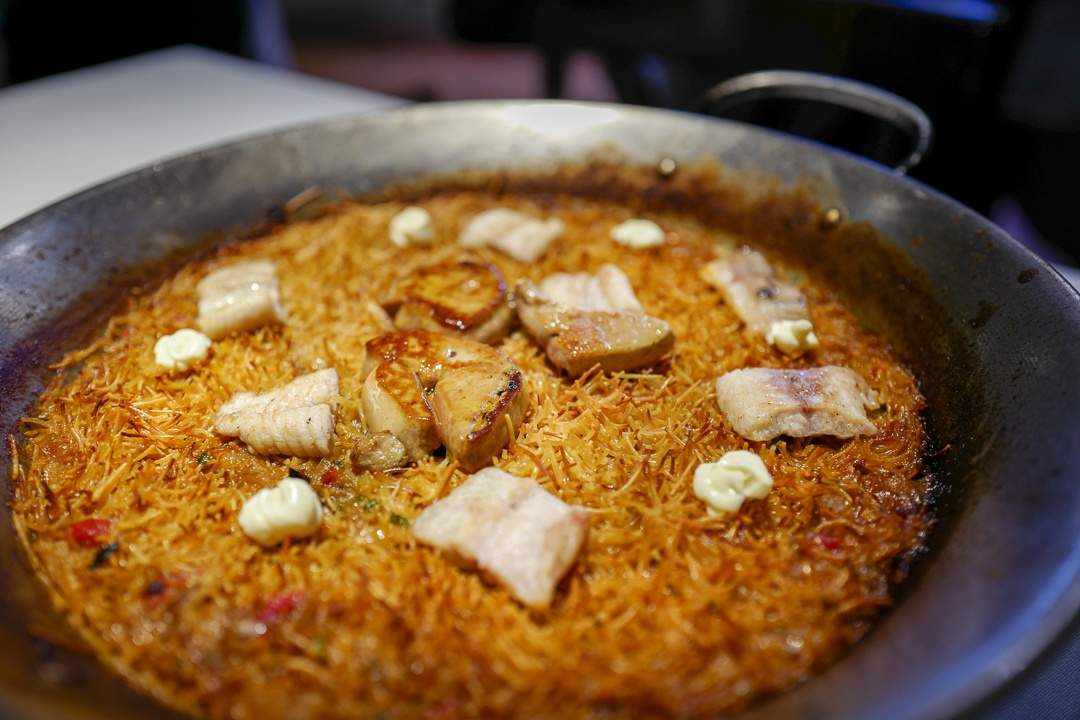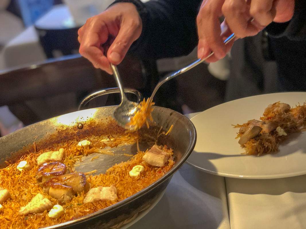 Når den stekes perfekt får du flere lag av forskjellige konsistenser. Vår Fideuà inneholdt røkt ål, små dotter med aioli, andekjøtt og -lever. Vi skrapte pannen.