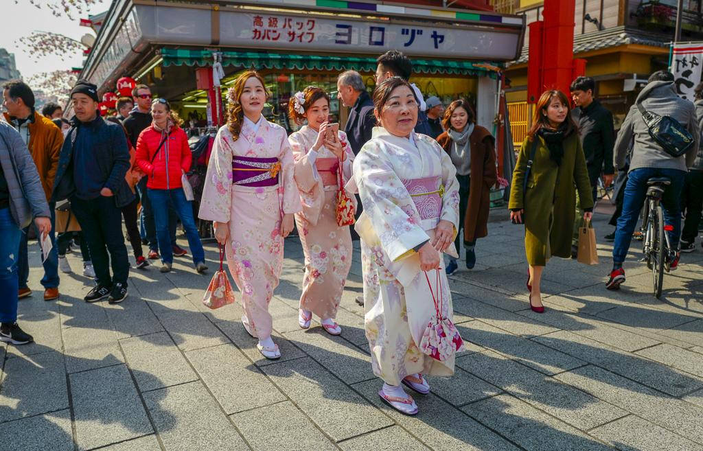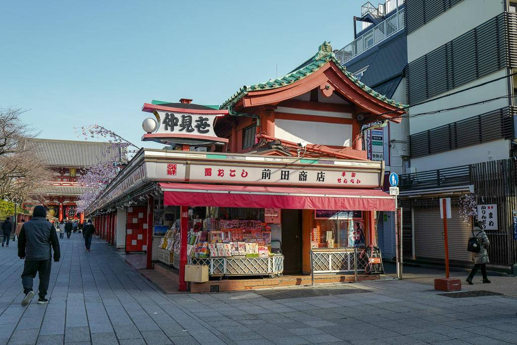 Mens jeg venter på lunsj drar jeg til bydelen Asakusa. Nakamise dori er en mat- og souvenirgate som leder opp til det mektige tempelet. Kom hit tidlig. Er du heldig kan du se geishaer i flotte kimonoer.