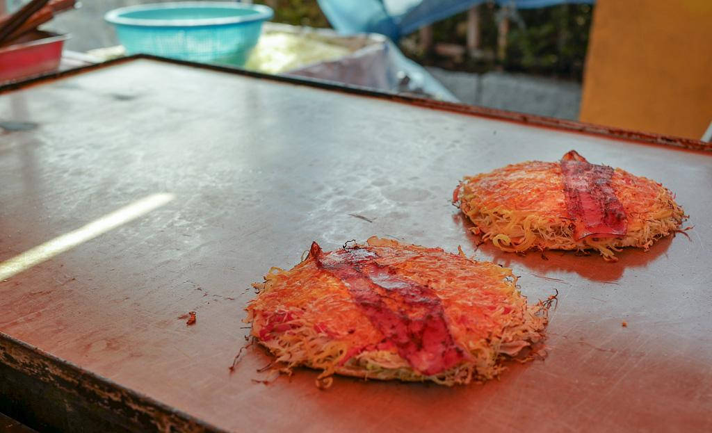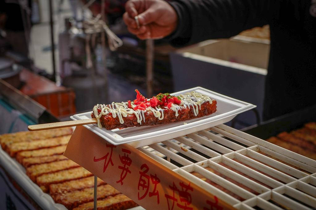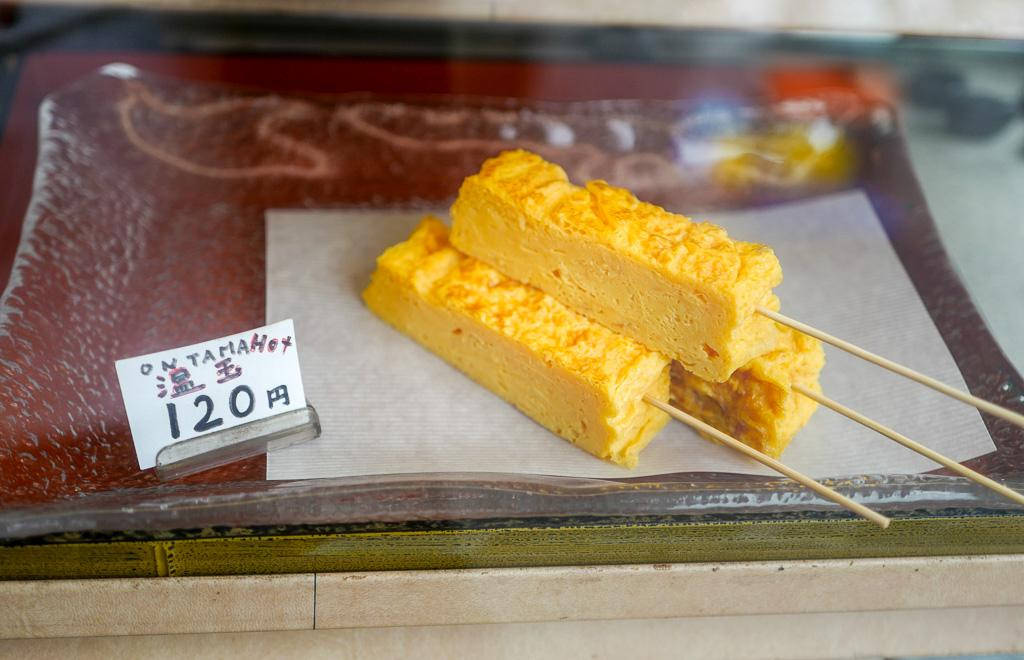 Her får du Taiyaki (fiskefomet kake med rød bønnepaste). Okonomiyaki ( japansk pannekaker), Ningyo-yaki (fylte småkaker som lages på stedet), Takoyaki (små munker med blekksprut). Grillet snøkrabbe, yakitori (grillspyd) laget av alle typer kjøtt og tamagoyaki (søt omsett på pinne).