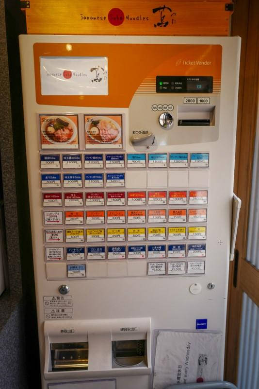Da står du i ny kø og kjøper maten på forhånd i automaten. Den står på japansk, men spør eller gjør research før du kommer dit. Jeg kjøpte shoyu soba til 1700 yen. (125 kr). Sobanudler, egg, svin, sopp, dumplings, kraft og trøffelsaus.