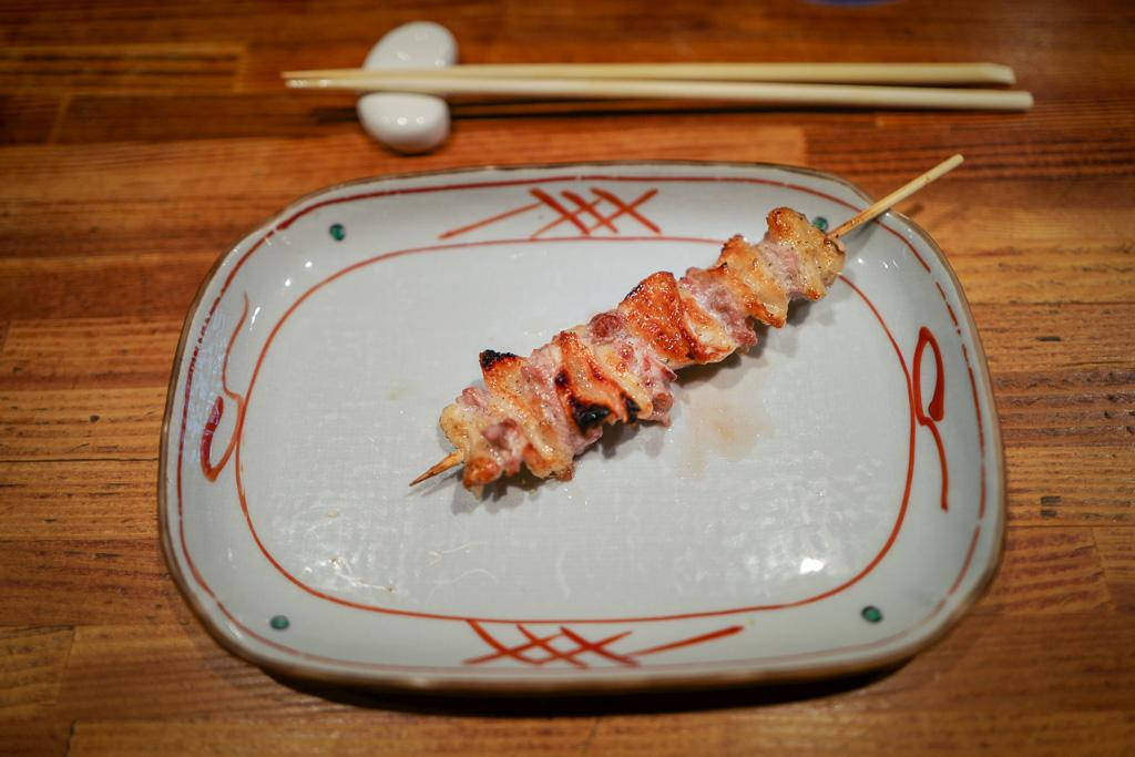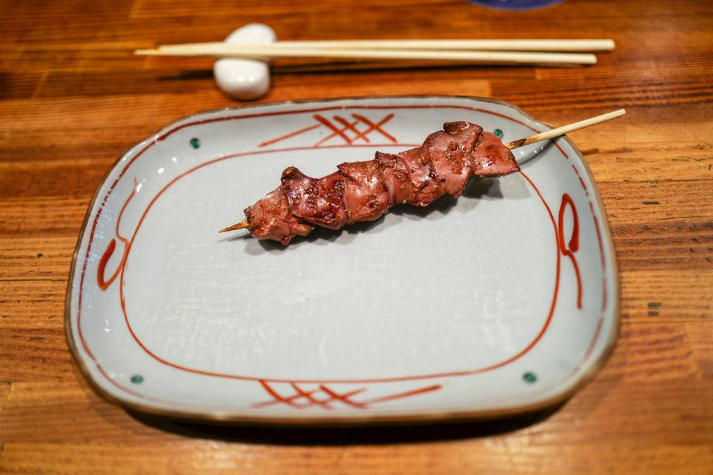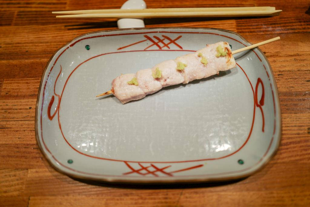 Bird Land serverer blant annet Omakase-meny der kokken velger hva du skal ha. Du får syv forskjellige kyllingspyd. Jeg velger en slik meny. Først får jeg en porsjon med forskjellige grønnsaker og kylling. Så en helt fantastisk kyllingleverpaté med toast.