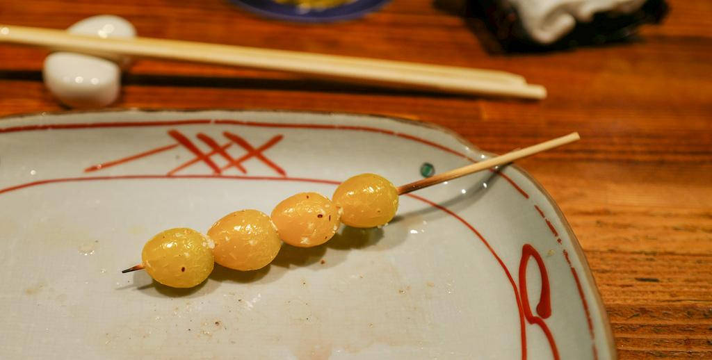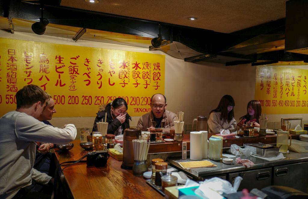 Dette et meget lokalt spisested der arbeidsfolk kommer innom for å spise lunsj. Tre gyoza og øl kommer på 334 yen – 24 kroner. Silkemyke dumplinps som jeg dypper i en slags ponzu-saus tilsatt noen dråper sesam-chiliolje. Så gode!