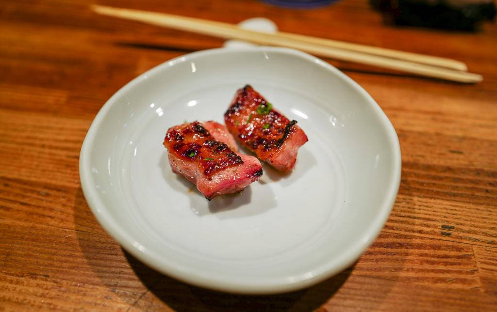 Nemlig Isonoya Sushi (stol på gps, for det engelske navnet står ikke på døren), spisested nummer to når du kommer inn på området. Jeg bestiller frokost-sushi og får en fantastisk misosuppe med rekehoder og grønn te i tillegg til biter av sushi som bare kommer og kommer. Jeg får også et par biter av den søte omeletten som er så populær.