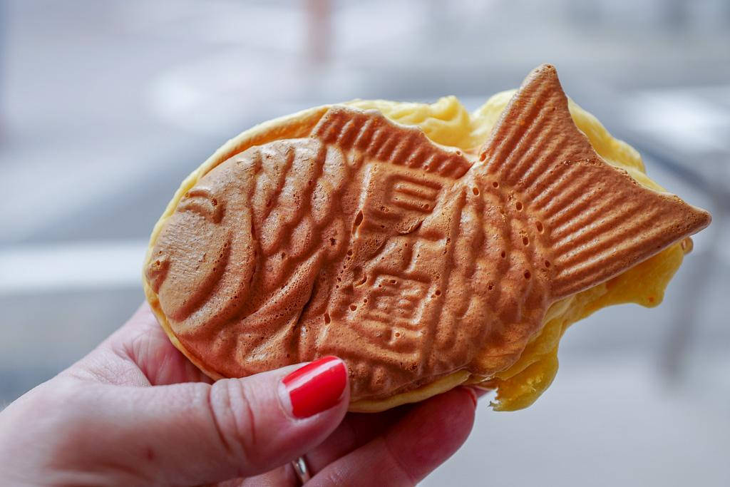 Litt lenger ned i gaten kjøper jeg Taiyaki (fiskefoprmet eggevaffel fylt med mørk og hvit sjokoladekrem). Så godt. Den er overraskende lett og myk., Fyllet pleier vanligvis å være laget av søt bønnepaste, men her får du også salte alternativer med ost og skinke.
