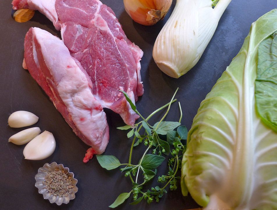 Ok. I gryten/crock-pot’n legger jeg også fennikelstrimler, hvitløk, laurbærblader, anisfrø, litt salt, hel pepper og oreganostilker. Så skjærer jeg halvparten av kålen og legger i gryten. Resten tilsetter jeg en halvtime før servering. Hell på vann slik at det dekker kjøttet. Sett på lokket og la dette stå på lav temperatur i mange timer til kjøttet faller fra beinet.