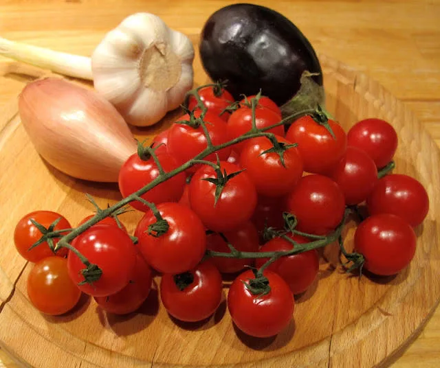 Banansjalottløk (vanlig sjalottløk eller vanlig løk går helt fint), fersk hvitløk, babyaubergin og herlige tomater.