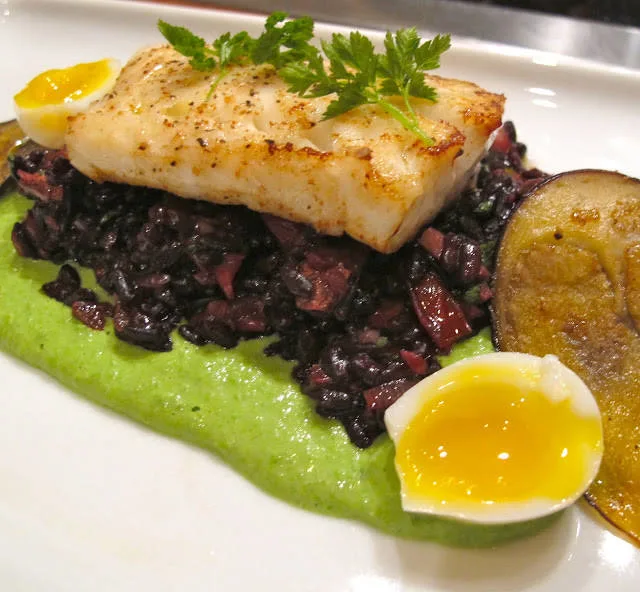 Dagens rett er pannestekt torsk og med et tilbehør bestående av sort ris med tomat, løk, hvitløk og chorizo, stekte skiver av aubergin, ertepuré og vaktelegg.