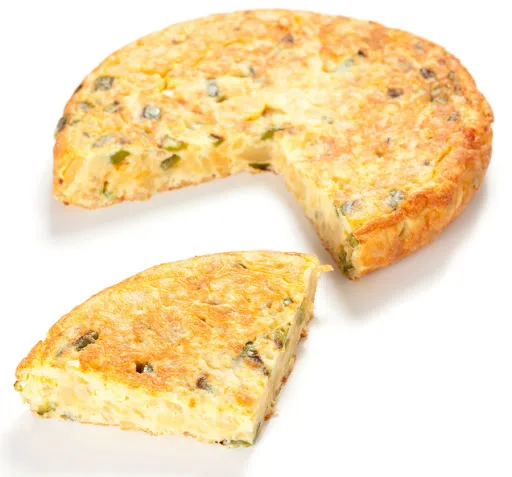 Varm en panne og legg poteter og løk i pannen. Hell over eggeblandingen og stek på svak varme med lokk over. Snu tortillaen når den er fast nok til å snus. Stek videre til den er lys brun og