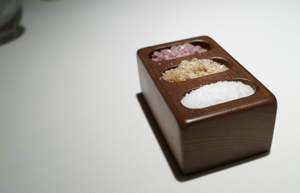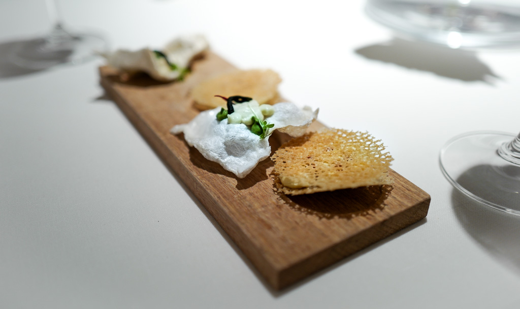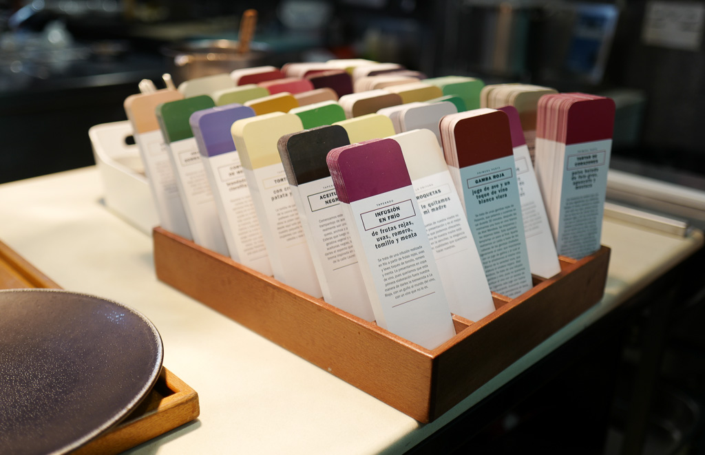 For hver rett som settes foran oss får vi et kort med beskrivelse av retten. Etter endt måltid får vi alle kortene samlet i en vifte, som kan minne om en klassisk Pantone-vifte for de som kjenner til den. For et genialt grep.