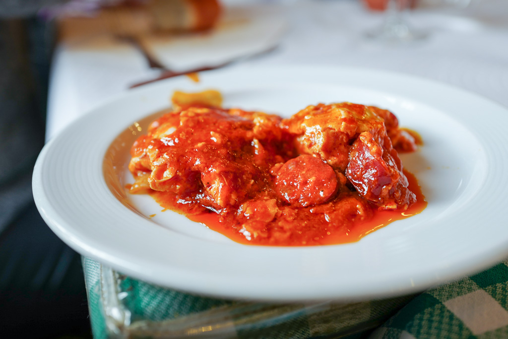 En annen rett som ga meg skikkelig go’følelsen var en enkel varmrett bestående av bakte egg i en saus av løk, paprika, tomat og chorizo. Den fikk jeg servert på et meget enkelt serveringssted etter at jeg hadde vært på ballongferd over vinmarkene i La Rioja. Mor i huset kom stolt ut med tallerkener til oss. Dette var åpenbart en av hennes spesialiteter. Det nydelige med retten er smaken av chorizofett som blander seg med grønnsakene og gjør retten fyldig. Eggene er posjert i gryta og ligger innkapslet som baller. Når du skjærer gjennom får du kremete plomme som passer perfekt til de andre smakene. Jeg skal prøve å lage denne retten en dag, så se opp for den på bloggen.