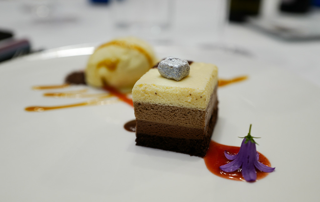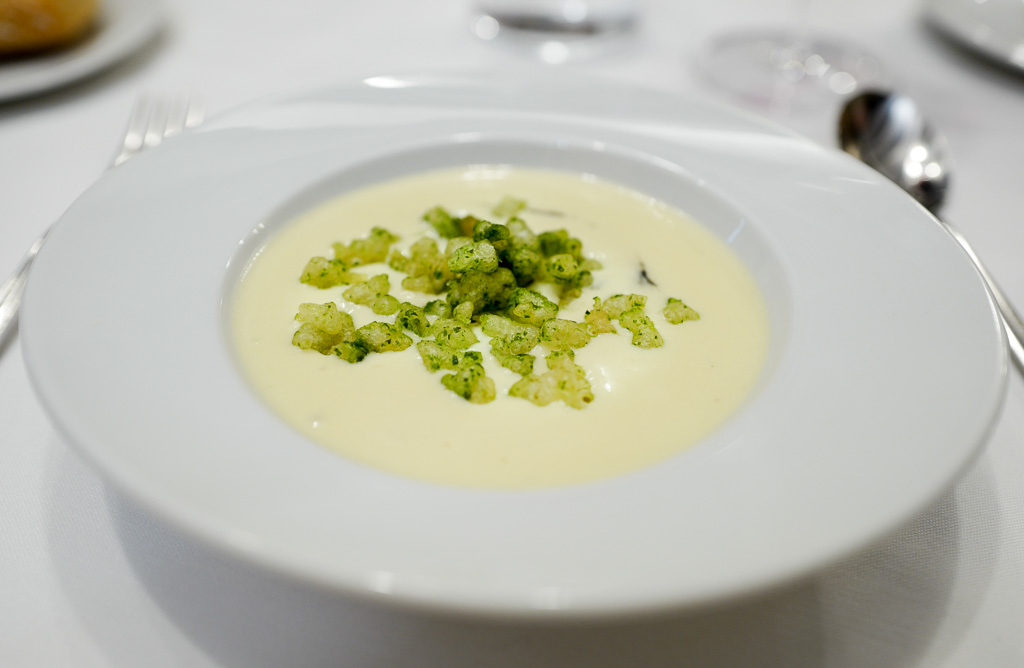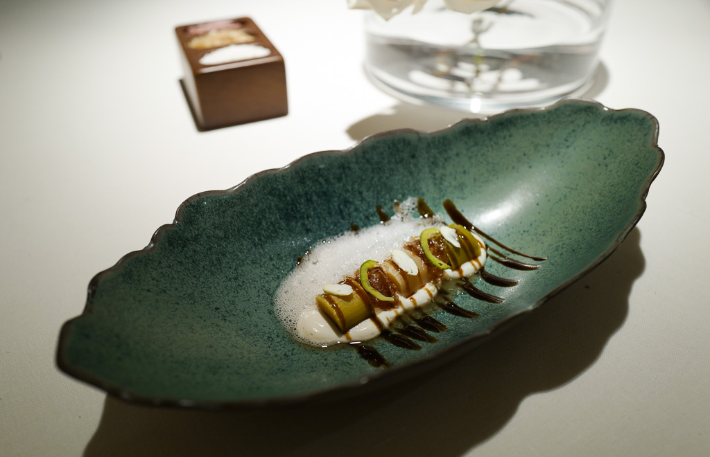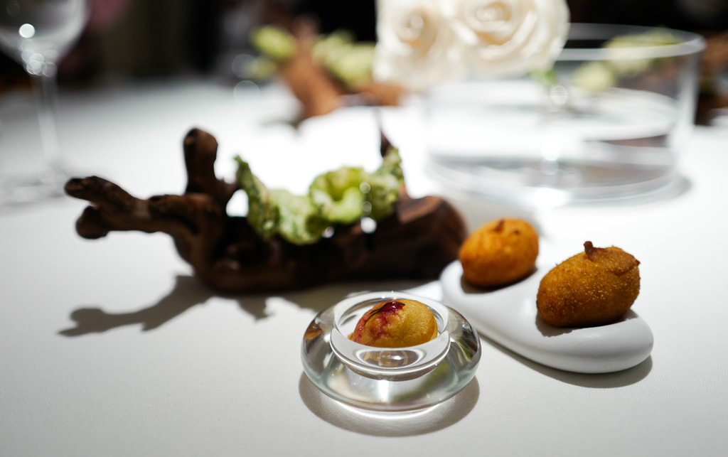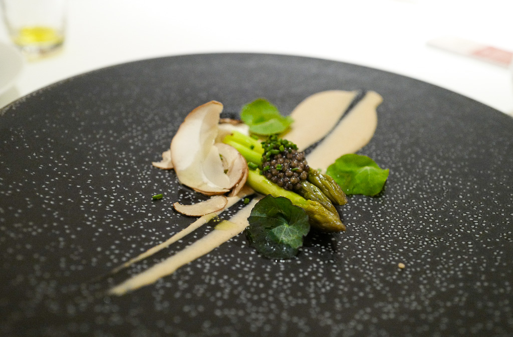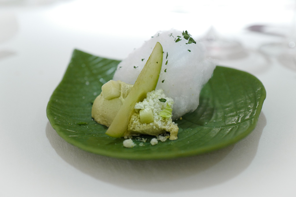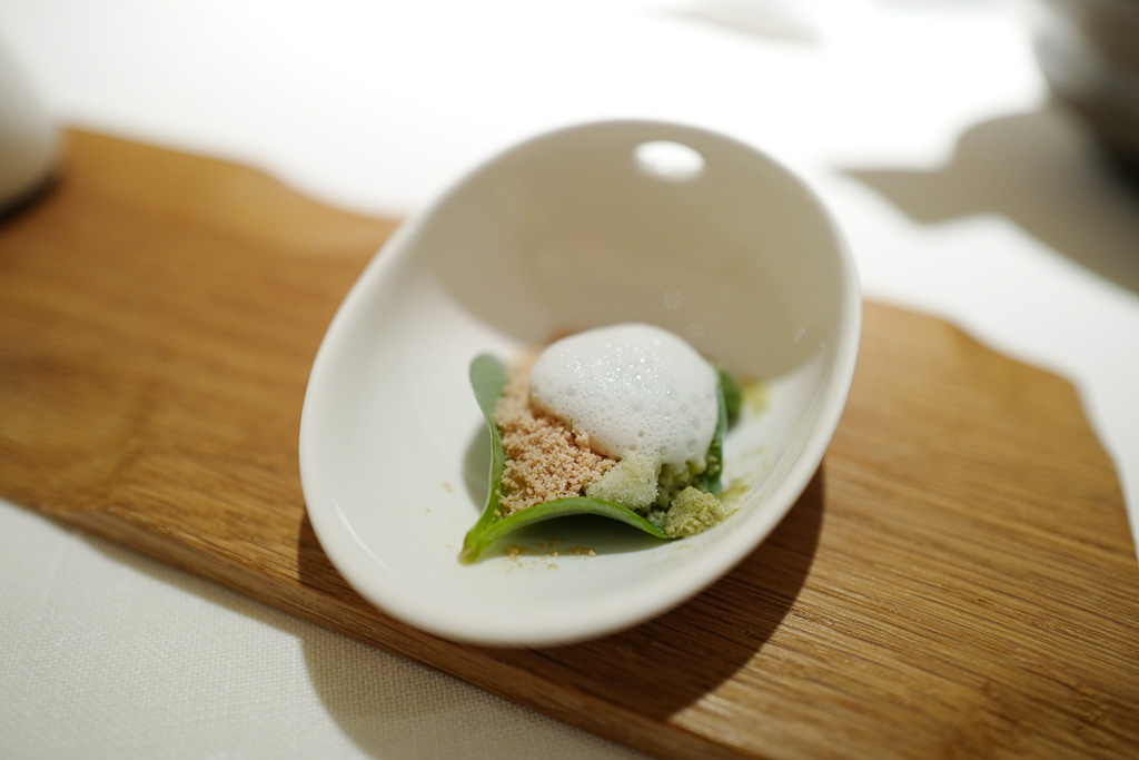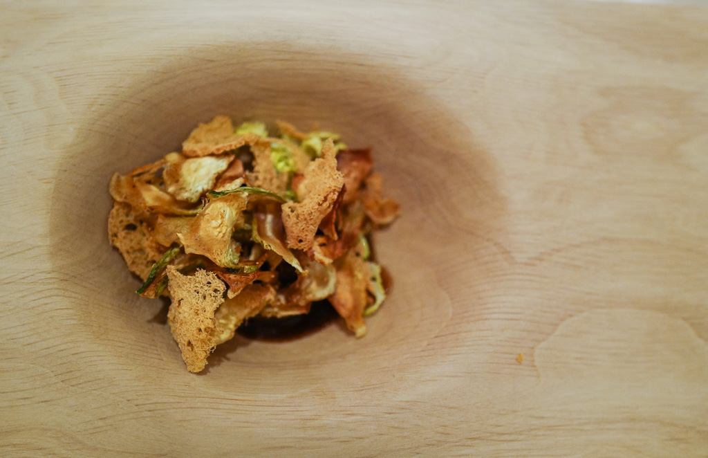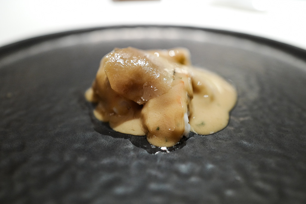Neste rett viser kokekunst på høyt plan. Vi får en «falsk» risotto laget av akkar og blekk. På toppen ligger et deilig potetskum og puffede riskorn med pestosmak. En helt nydelig rett.